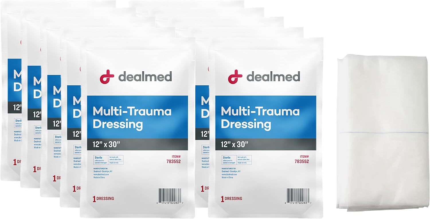 Multi-Trauma Wound Dressing: The Dealmed Multi-Trauma Dressing is a sterile, non-woven, absorbent pad, that helps in emergency and first aid settings. It is ideal for the treatments of burns, lacerations, fractures and the perfect addition to your first aid kits for when emergencies and traumas arise.