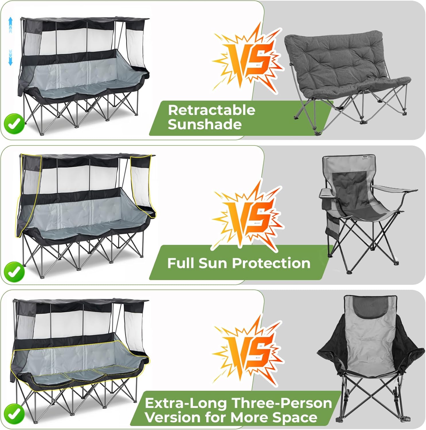 Sun protection design: This 3-person camping chair, This three-person camping chair features a foldable back sunshade design, providing UV protection and a cool camping experience. The foldable design offers enhanced stability and secure fastening, allowing for instant opening or closing to meet diverse outdoor needs.