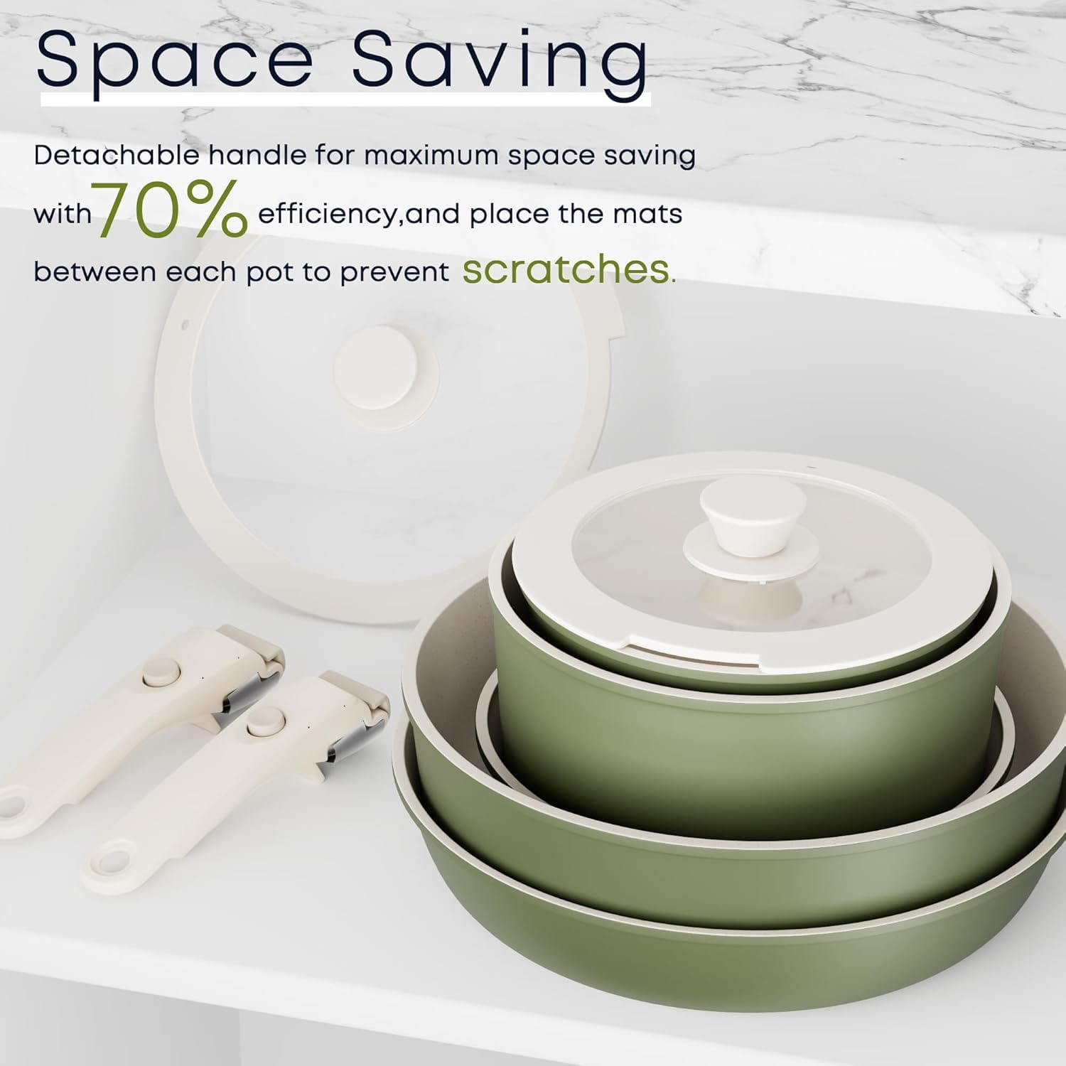 Save more space – Detach the handle and nest each piece one inside the other. Place the mats between each pot to prevent scratches, This is not available in other brands.
