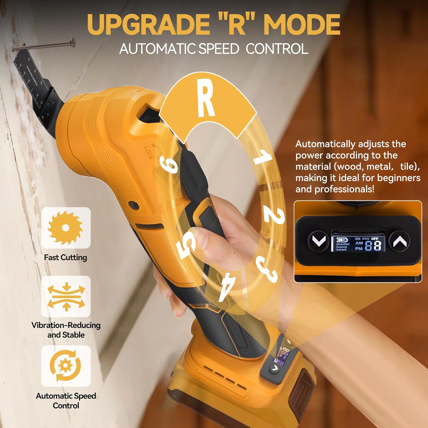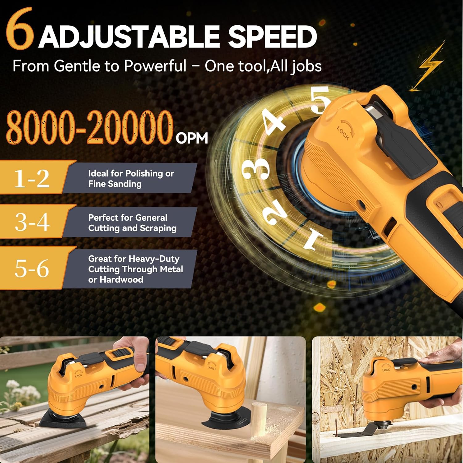 Upgrade Smart Auto Mode & 6 Variable Speed: The cordless oscillating tool features a smart auto mode that automatically adjusts the oscillation speed based on resistance, optimizing power output and protecting materials—ideal for both precision detail work and demanding professional use. The 6 adjustable speeds ranging from 8,000 to 21,000 OPM give you full control for different materials and cutting depths. Use lower speeds for polishing or soft materials, and switch to high speeds for fast metal or wood cutting