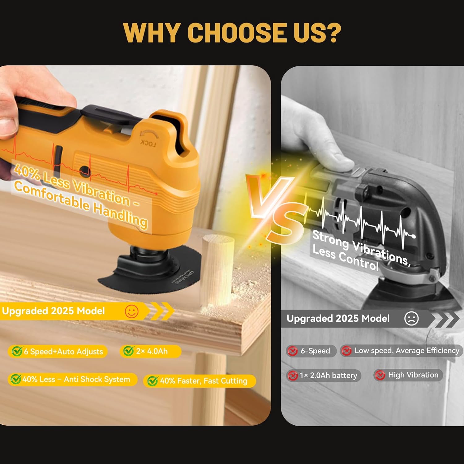 Anti-Vibration & LED Design: The upgraded oscillating multi tool features an advanced anti-vibration structure that minimizes hand fatigue during long use. With an optimized brushless motor and internal vibration dampening pads, this oscillating multi tool runs smoother and steadier than conventional models.. The built-in LED light ensures excellent visibility in dark or confined areas, making this cordless oscillating power tool perfect for detailed interior or corner work