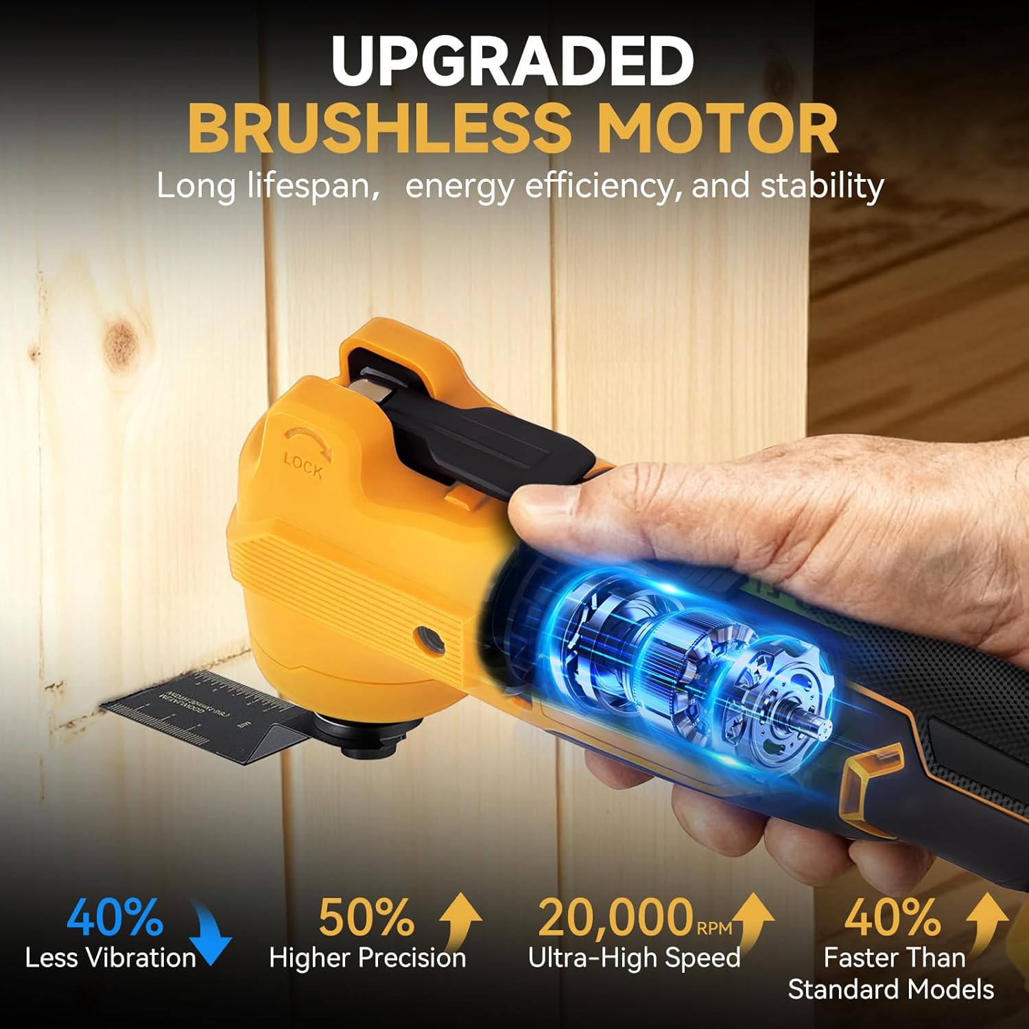 Powerful Brushless Motor: Powered by a high-performance brushless motor, this oscillating tool delivers 30% higher efficiency and a longer lifespan compared to brushed models. The motor provides consistent torque output with less heat generation, ensuring smoother cutting and sanding even under heavy load