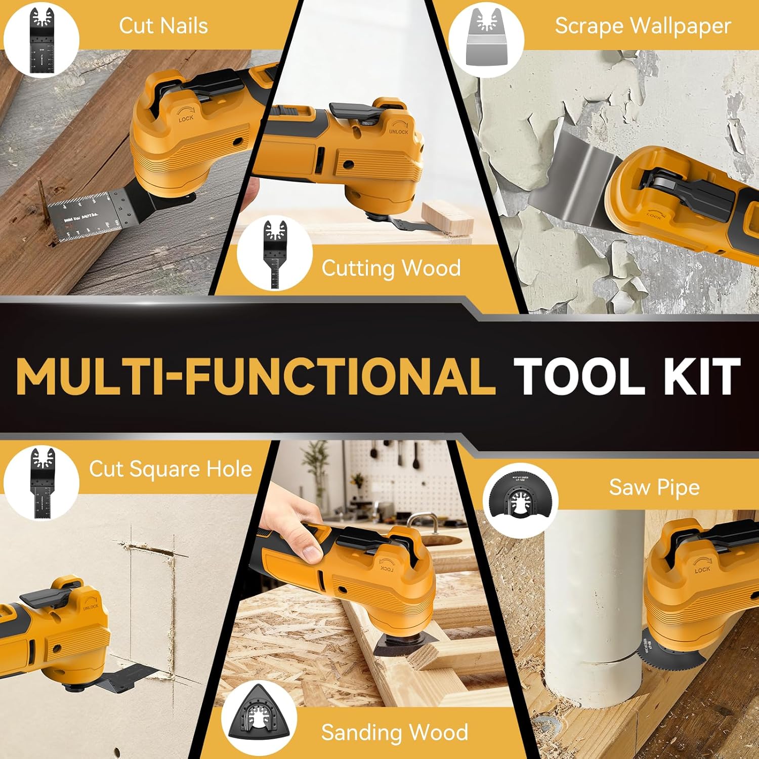 Comprehensive Accessory Kit: This oscillating saw tool includes 23PCS oscillating tool accessories, including saw blades, sanding pads, and scrapers. The tool-free blade change system allows quick accessory swaps, keeping workflow efficient and uninterrupted. Fully compatible with Dewalt oscillating tool blades and most universal oscillating accessories, this brushless oscillating multi tool is an all-in-one solution for cutting, sanding, polishing and scraping