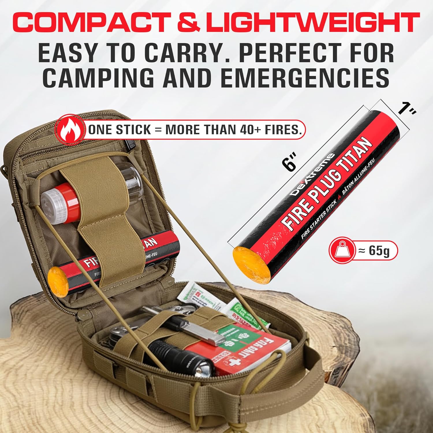 WHAT YOU GET – Includes 1 Dextreme Fire Plug Titan stick. Approx. 6″ long × 1″ diameter, ~65g. Store dry and you’ll always have reliable tinder ready when conditions are tough.