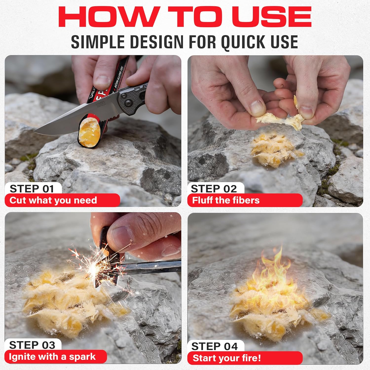 EASY TO START – With its super-fast ignition, the Fire Plug XL can be lit with only a little spark. Use your ferro rod, fire steel, flint, or flame, and you can even rely on a trusty Bic lighter that has run out of fluid! Cut the desired amount, fluff the cotton to see the microfiber, add sparks, and build your fire!