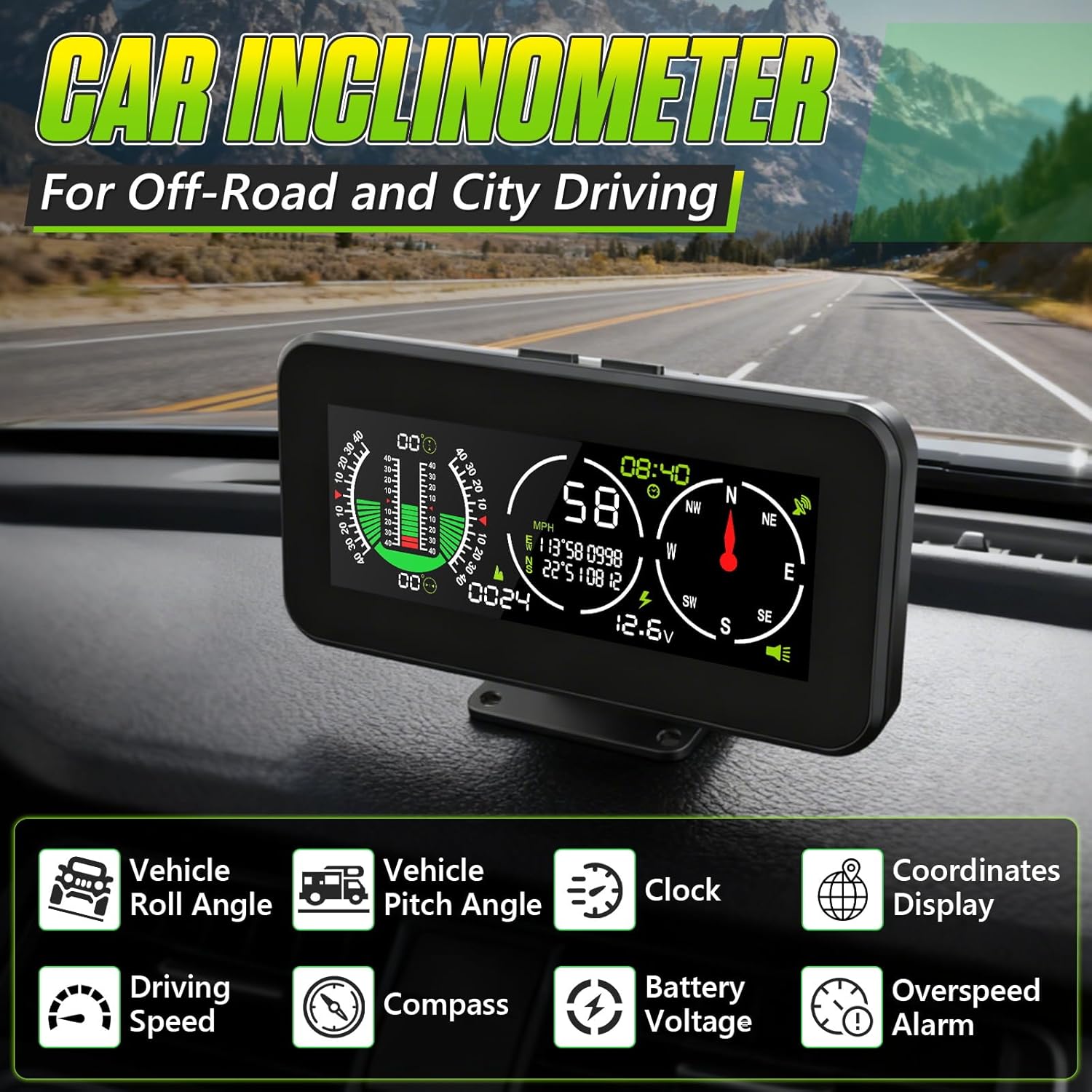 1.Vehicle Pitch & Roll Angles 2.Driving Speed & Altitude 3.Travel Direction 4.This essential information significantly boosts off-road safety and control. The included freely rotating stand mount ensures perfect visibility at any angle.