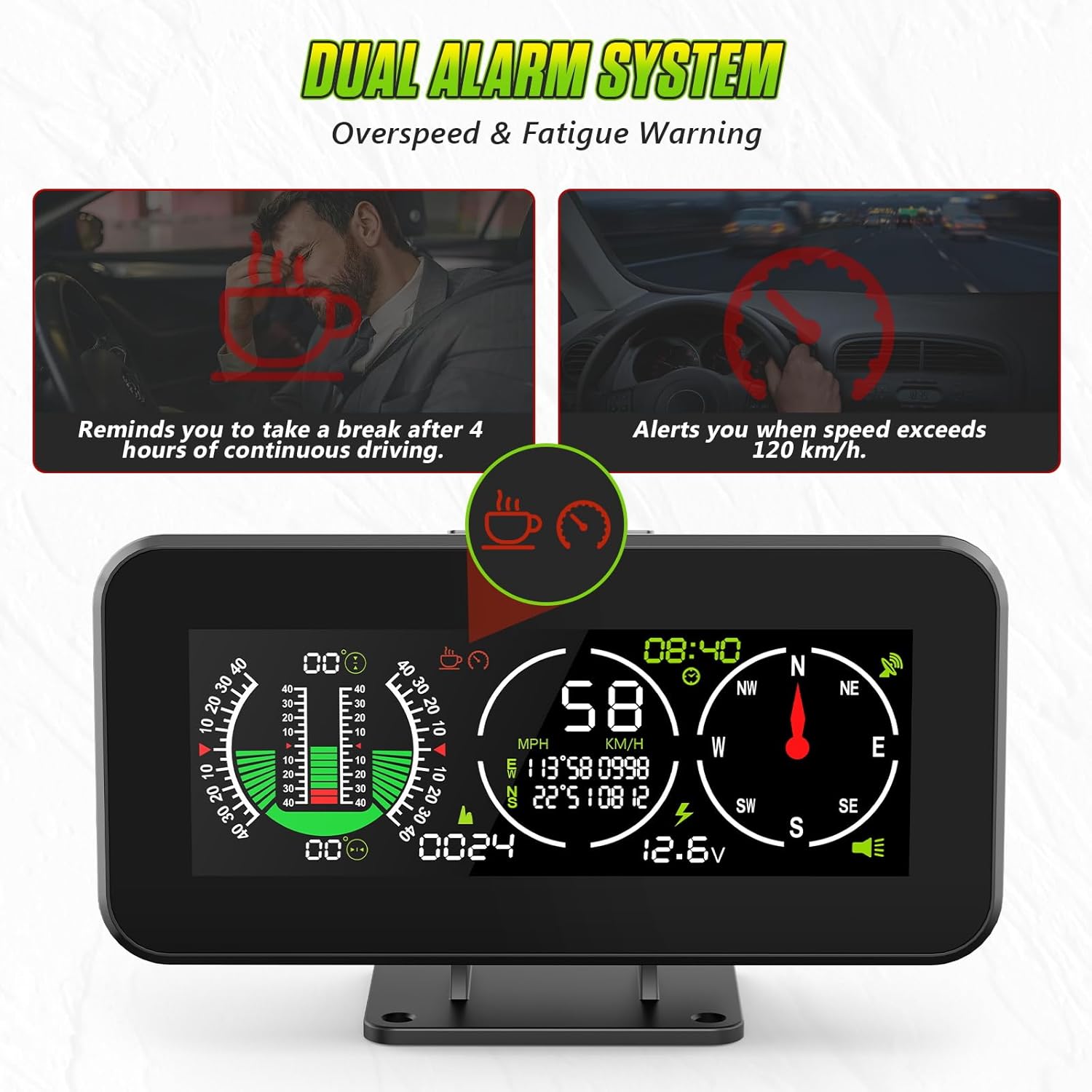 【All-in-One Multi-Function Display】Features a high-definition LCD that shows speed, tilt angle (roll & pitch), battery voltage, satellite time, compass, altitude, and coordinates—all on one screen. Equipped with a 6-axis gyroscope for highly accurate readings and speed/fatigue driving alerts to enhance driving awareness.