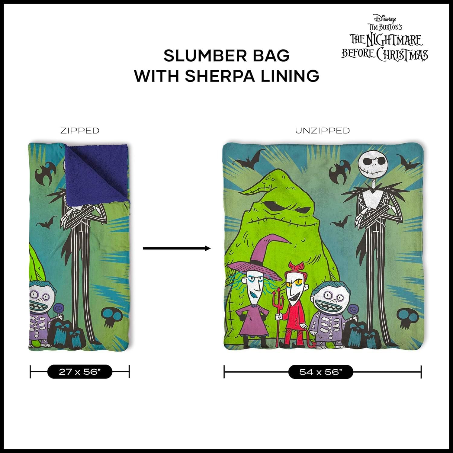 This Disney throw blanket bundle includes 1 Nightmare Before Christmas sleeping bag features an spooky design of Jack Skellington, Oogie Boogie and familiar faces of Halloween Town.