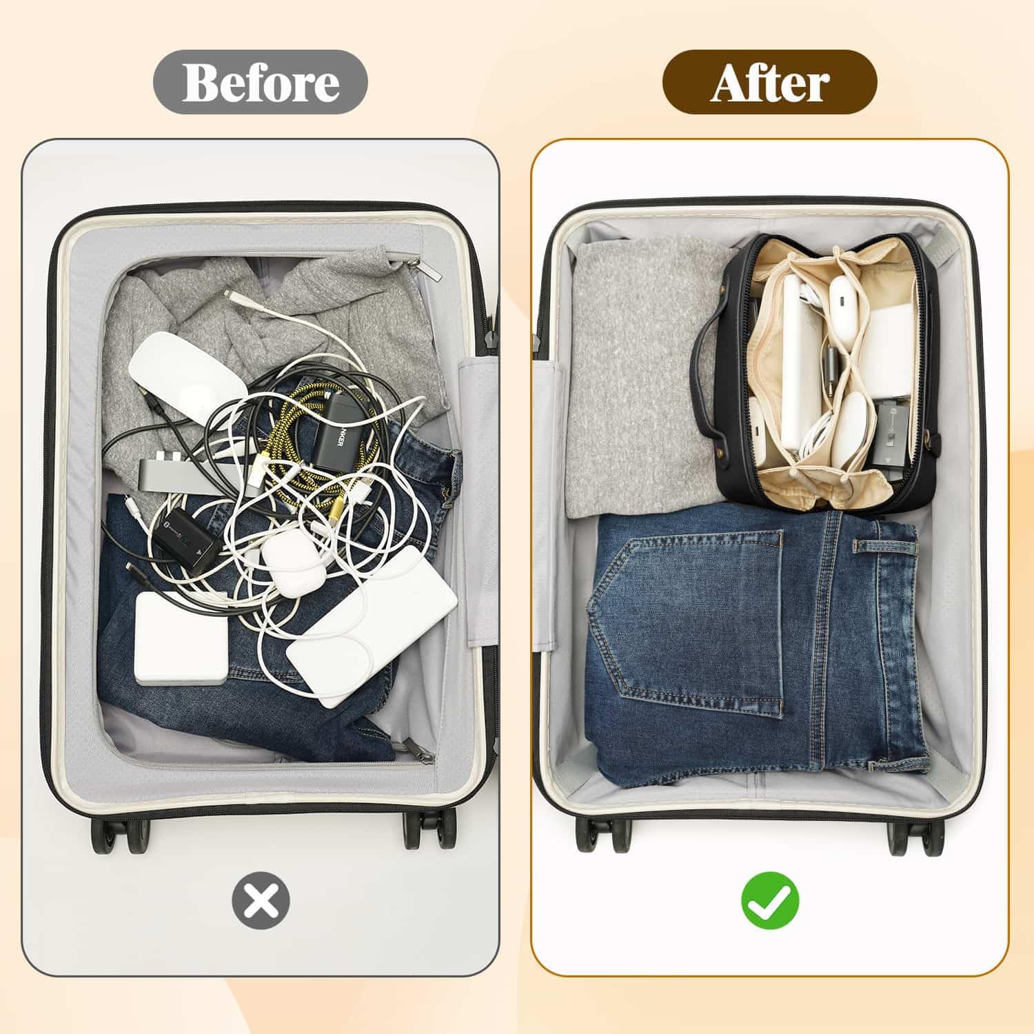 Smart Organization:This tech pouch helps you find gear in a flash. It features smart compartments for all essentials and a removable panel for tiny items like SD cards. The ultimate cord organizer, it ensures everything has its place
