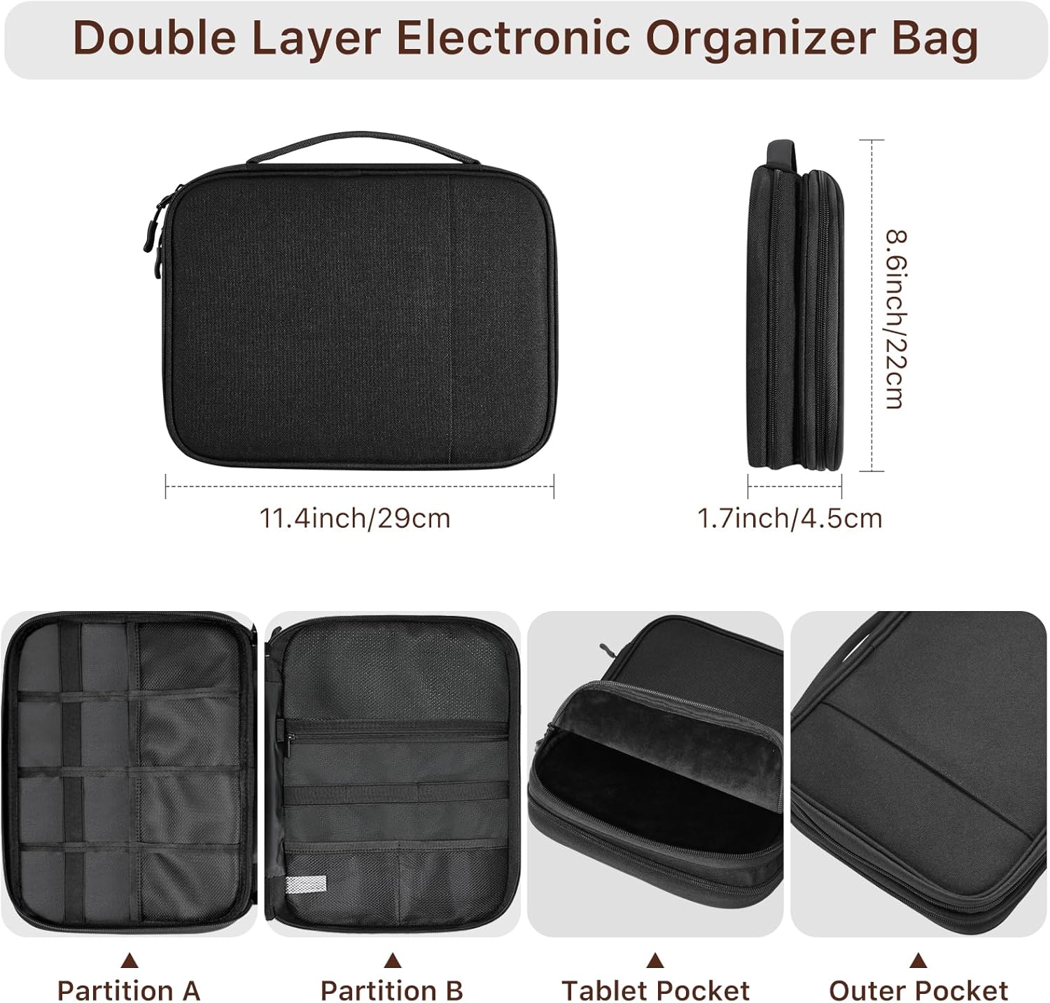 Double-layer Large Capacity:Our double-layer electronics organizer bag is roomy enough to store your electronic accessories. It features 1 separate tablet pocket (fit for iPad 10th Gen 10.9″, iPad 9/8/7th Gen 10.2″, iPad Pro 11″, iPad Air 11″, iPad Air 5 4 10.9″, Galaxy Tab A9+ Plus 11″, Galaxy Tab S9 FE 10.9″, reMarkable 2 10.3″, Tab M11 11”; and other 9-11 inch device), 1 zippered mesh bag, 6 open mesh bags, and 7 elastic bands to organize other tech gadgets like chargers, cables, etc.