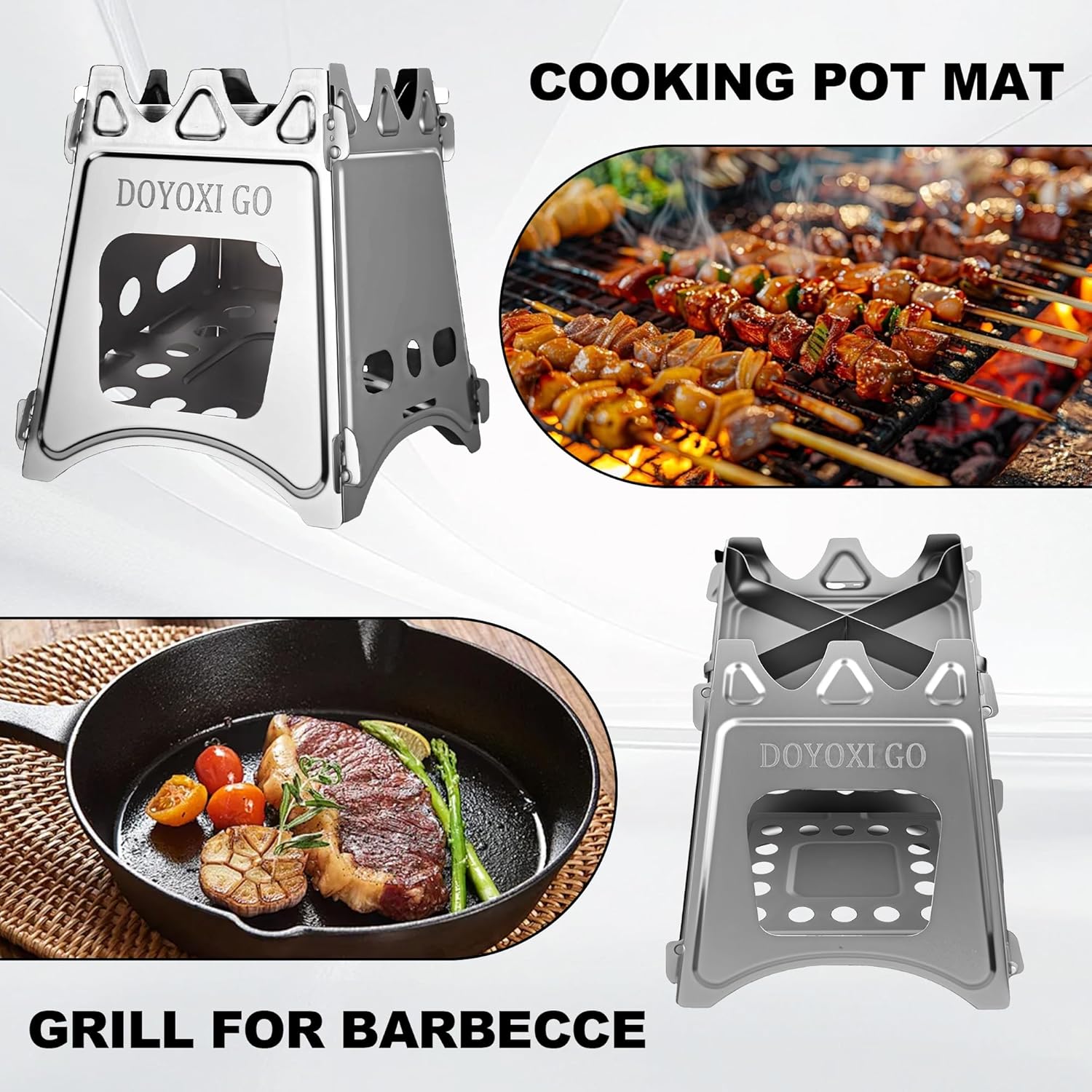 Sturdy & Rust-Resistant: Crafted from high-grade stainless steel, the DOYOXIGO camping wood stove boasts durability to withstand heavy cookware and high temperatures, plus rust resistance for long-term outdoor use. Its cross-stand trivet offers a stable platform on uneven ground, while air vents enhance ventilation for efficient burning. This robust camp stove combines strength with lightweight design, perfect for reliable outdoor cooking.