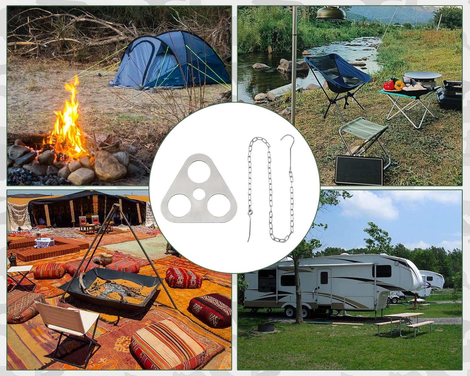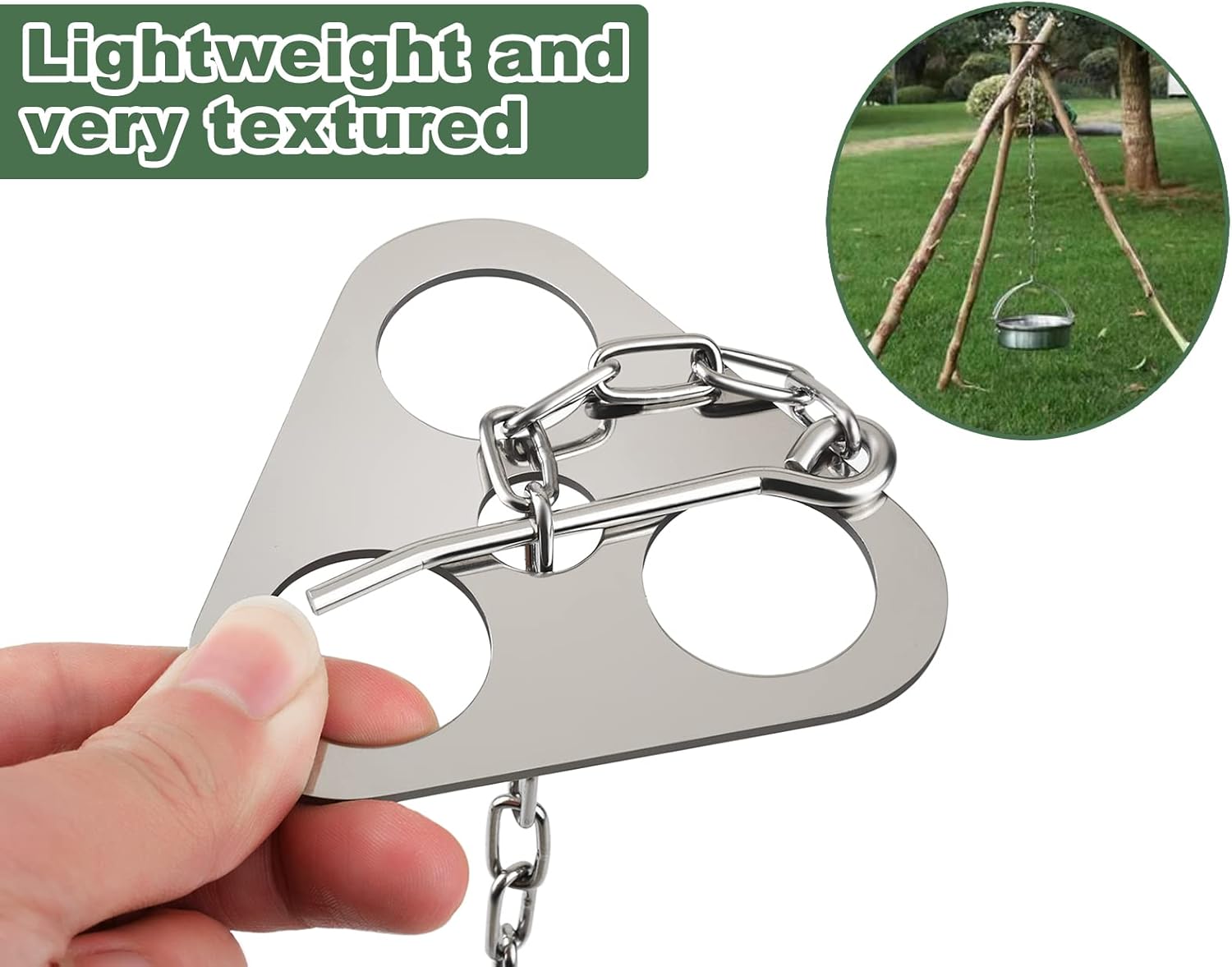 Easy to Assemble:Simply find three branches, insert them through the three-hole plate, attach the hook and chain, and adjust the length for cooking tripod stability
