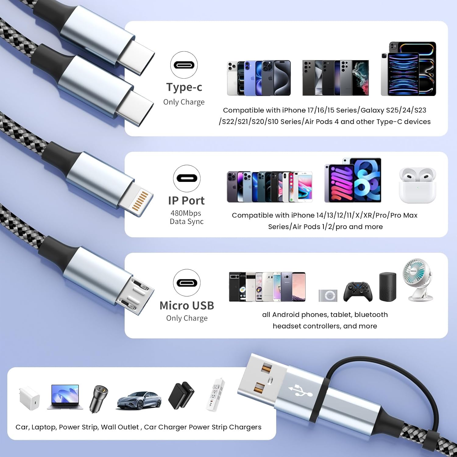 【UNIVERSAL COMPATIBILITY】4 in 2 charging cords for multiple devices compatible with all iPhone 17 16 15 14 13 12 11/SE/X/8/7/6/5 Series, Pad/Pod/ Galaxy UItra/S24/s23/s22/s21/s20/s10/s9/s8/s7/s6/s5/Note 10/10/9/8, HTC, LG, PS 4/5 and most other mobile phone charging, as well as cabinet lights; portable mini fans, ps5 and more.(Only the lightn-ing port supports Data Transfer and CarPlay, 480 Mbps data sync).