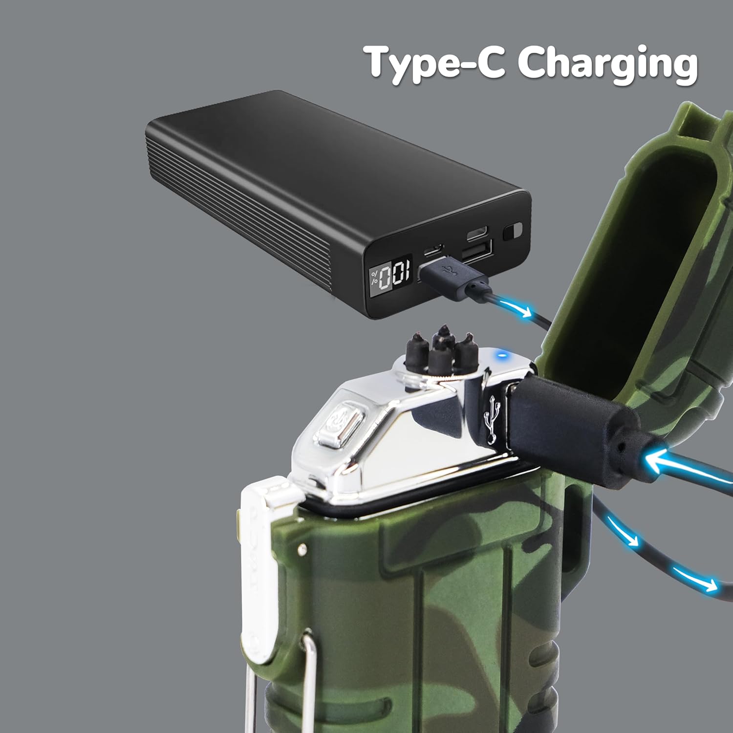 WATERPROOF & WINDPROOF – This lighter is built with metal-ring sealed cover and locking clasp. IP56 Waterproof System allows them work well in rainy day and windy day. The arc lighter’s flameless have a function of wind resistance. A necessary tactical gear for the outdoors