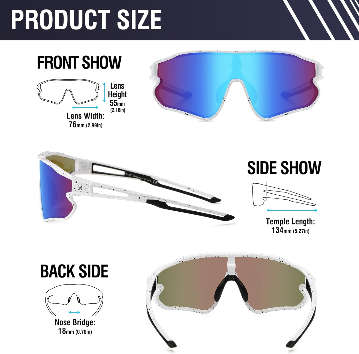 【PRODUCT SIZE】- Lens Width 76mm|2.99in; Lens Height 55mm|2.16in; Nose Width 18mm|0.7in; Leg Length 134mm|5.27in; Frame Width 142mm|5.59in.