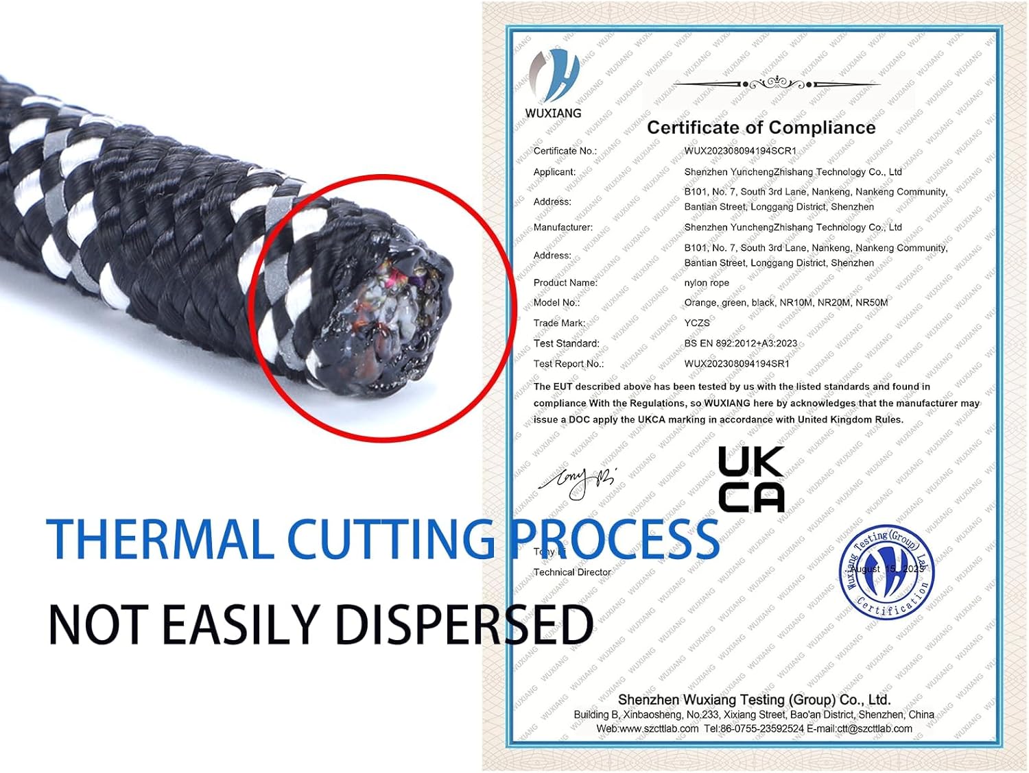 【CE Certified】Our static climbing rope meets the CE Certification of EN 892:2012+A3:2023 Standards (Certificate No.: WUX202308094194SR1),ensuring quality control. Bright color ensure great visibility in all weather.