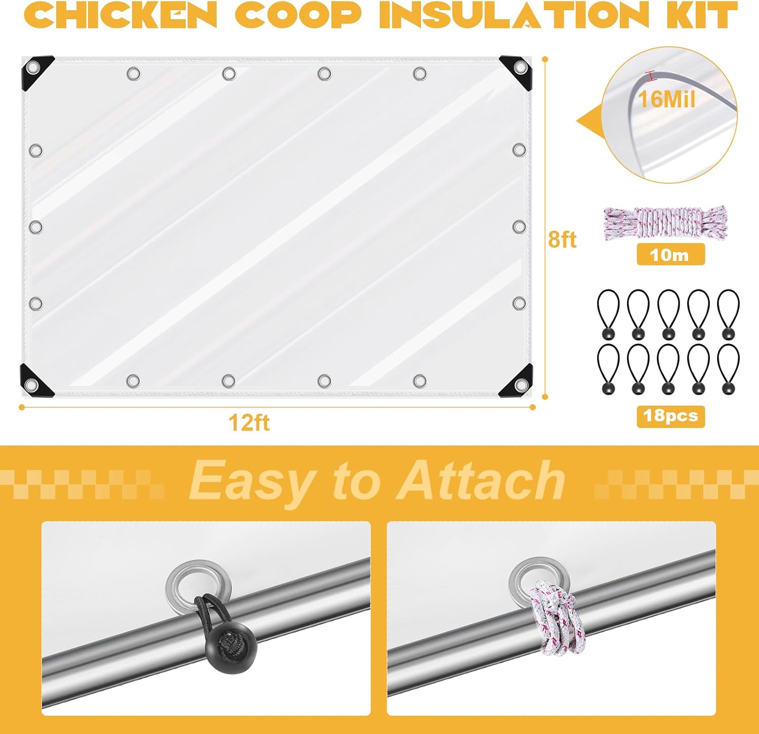 Reliable Chicken Coop Insulation for Winter—You will receive a chicken coop cover measuring 8x12ft,18pcs 7.8in elastic ties and 33ft rope.The tarp cover is pretty durable and have grommets all the way around,rope and elastic ties ensures you can install and secure more quickly.