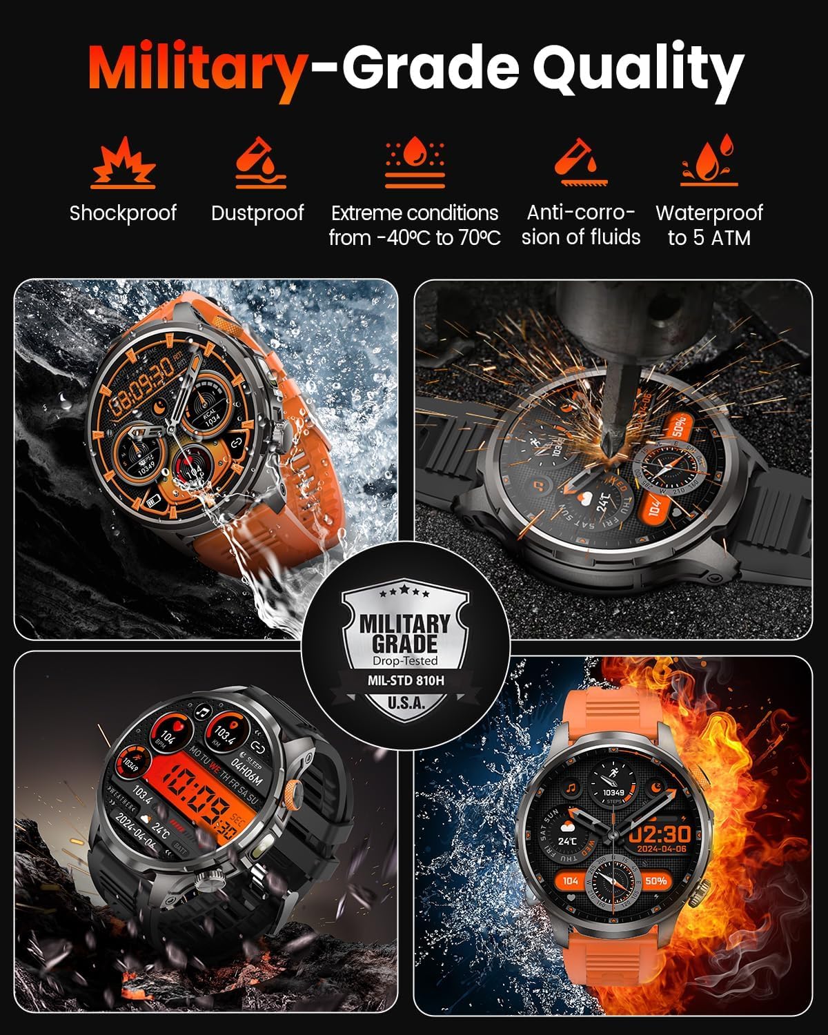 Built To Last And Withstand – BANLVS Tactical smart watch is built for top-of-the-line performance wherever the trail takes you, from frozen mountain peaks to dusty deserts. Military watch supports 187.96°F heat resistance, -82°F cold resistance, 50m waterproof, 50m drop and shock resistance, 150 hours in a salt spray environment, and with anti-magnetic function