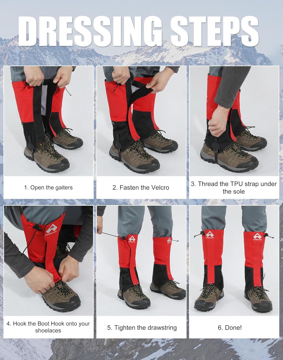 The video showcases the product in use.The video guides you through product setup.The video compares multiple products.The video shows the product being unpacked. Pioneer Camp Snow Gaiters for Men Women Merchant Video