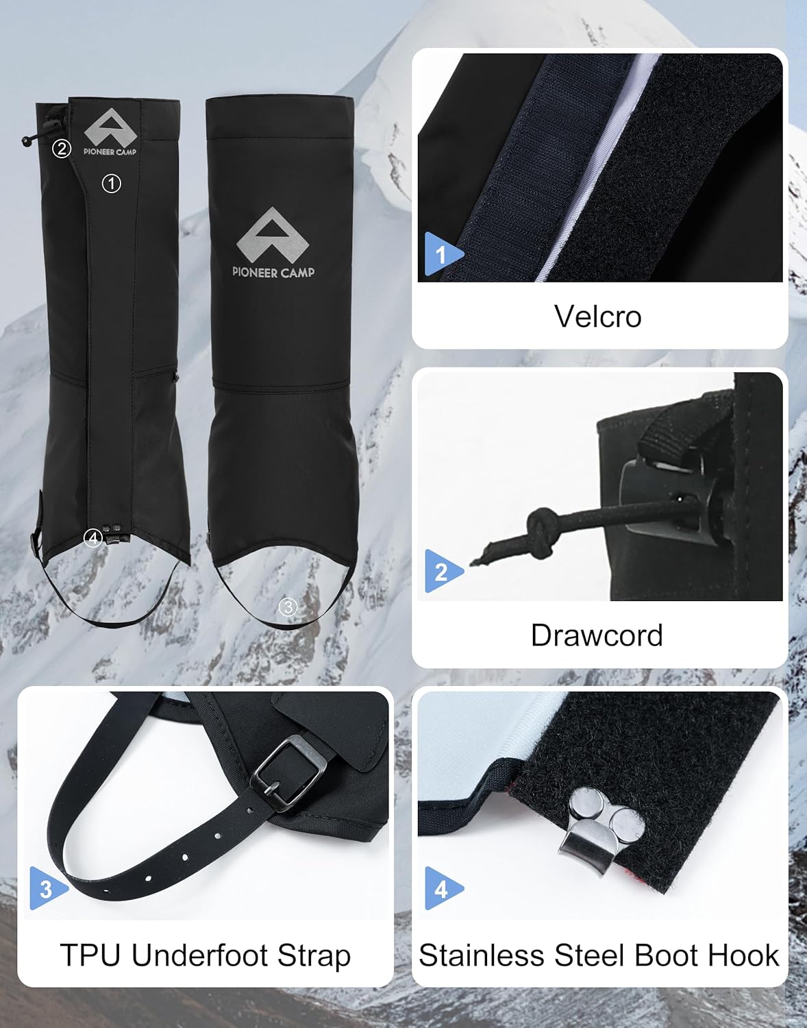 Durable Fit & Easy Adjustments: Designed with high-quality Velcro that won’t pill or snag, a stainless steel boot hook, and a rugged TPU underfoot strap for adjustable fit and added grip. Quick-pull buckle allows instant tension adjustment and easy on/off, even with gloves on.
