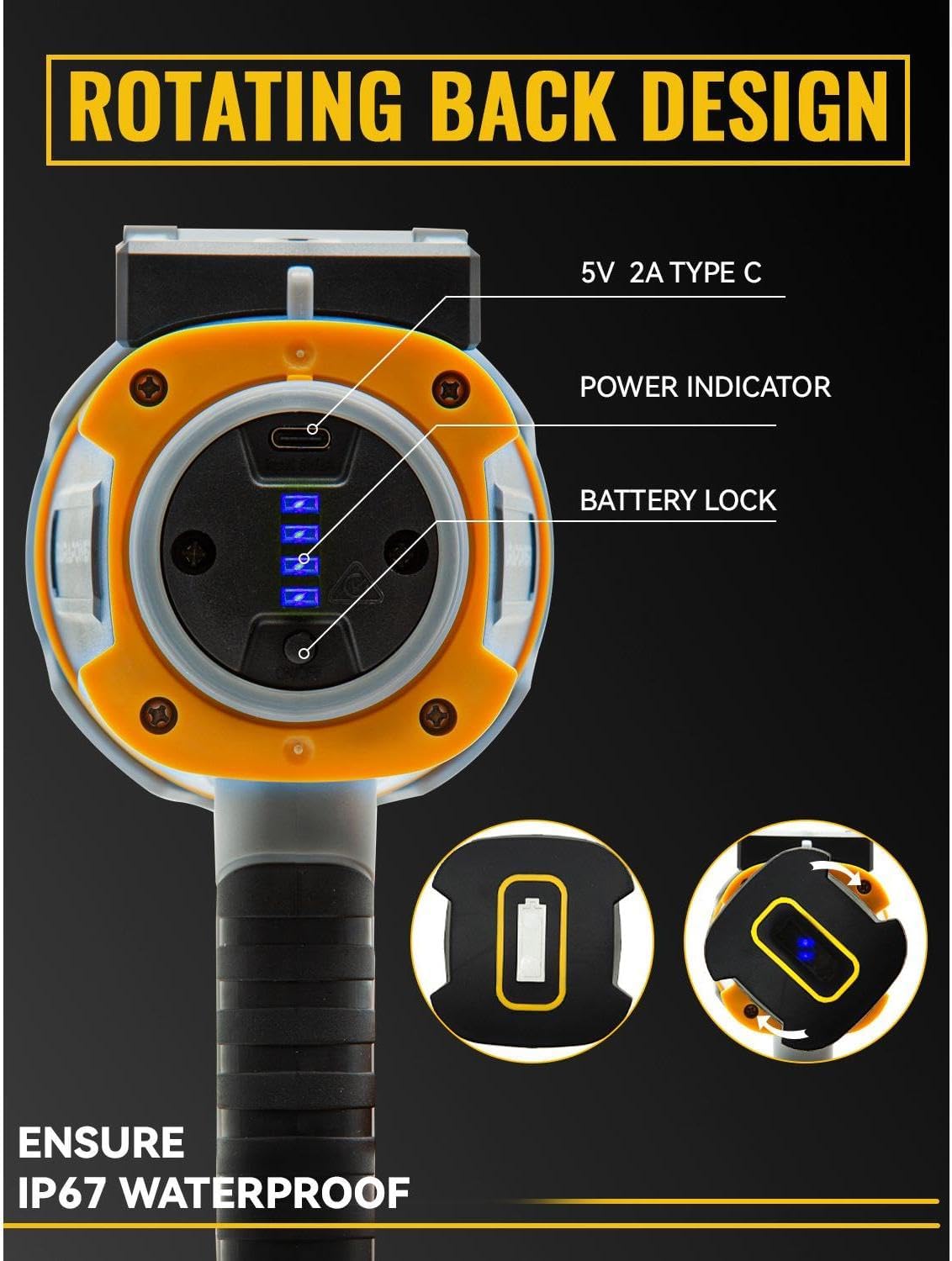 【IP67 Waterproof Spotlight】: Our certified IP67 waterproof Bright Spotlight could be submersible up to 3ft. Its unique back cover design protects the power indicator, battery lock, and charge port.