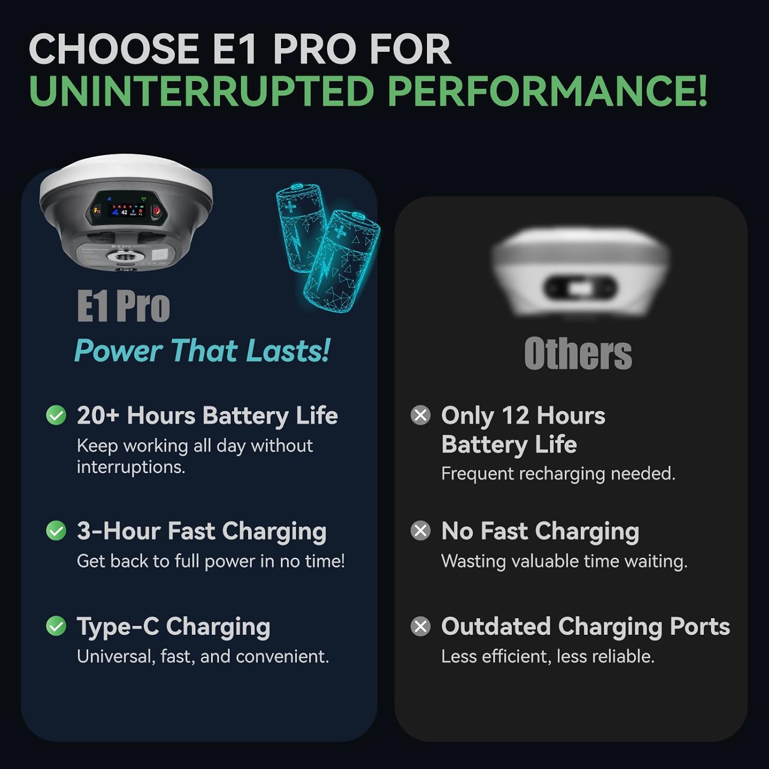 Charge Once, Work All Day: Our E1 PRO RTK surveying equipment has 6700mAh battery = 20+ hours of continuous ops. When you do need juice, the USB-C port delivers 0-80% in under 90 minutes. Spend less time waiting and more time billing hours.