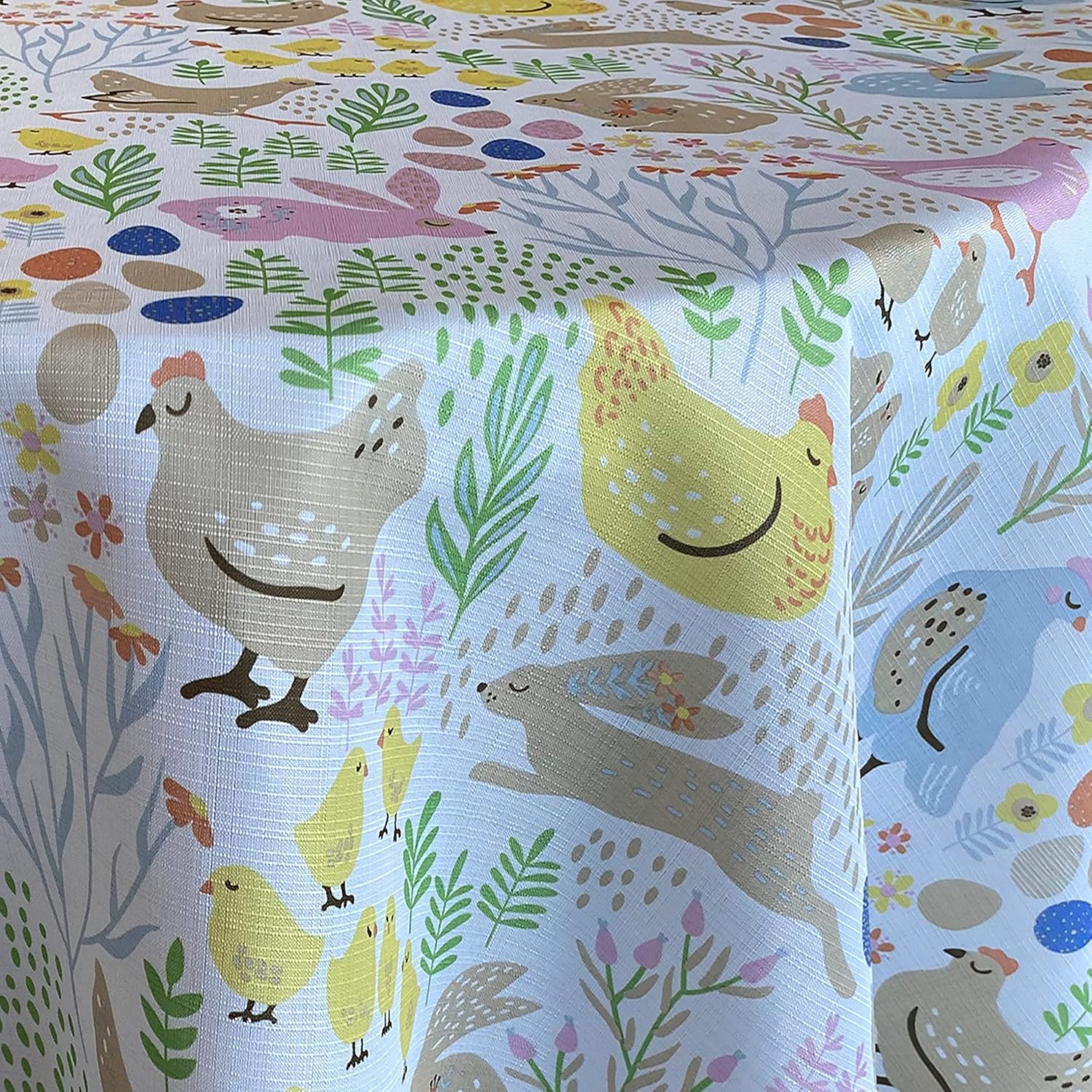 STYLING: The Home Bargains Plus Spring Fun Fabric Tablecloth, features an allover tableau of pastel colored Bunnies decorated with flowers and an assortment of Chicks, Hens on a white background.