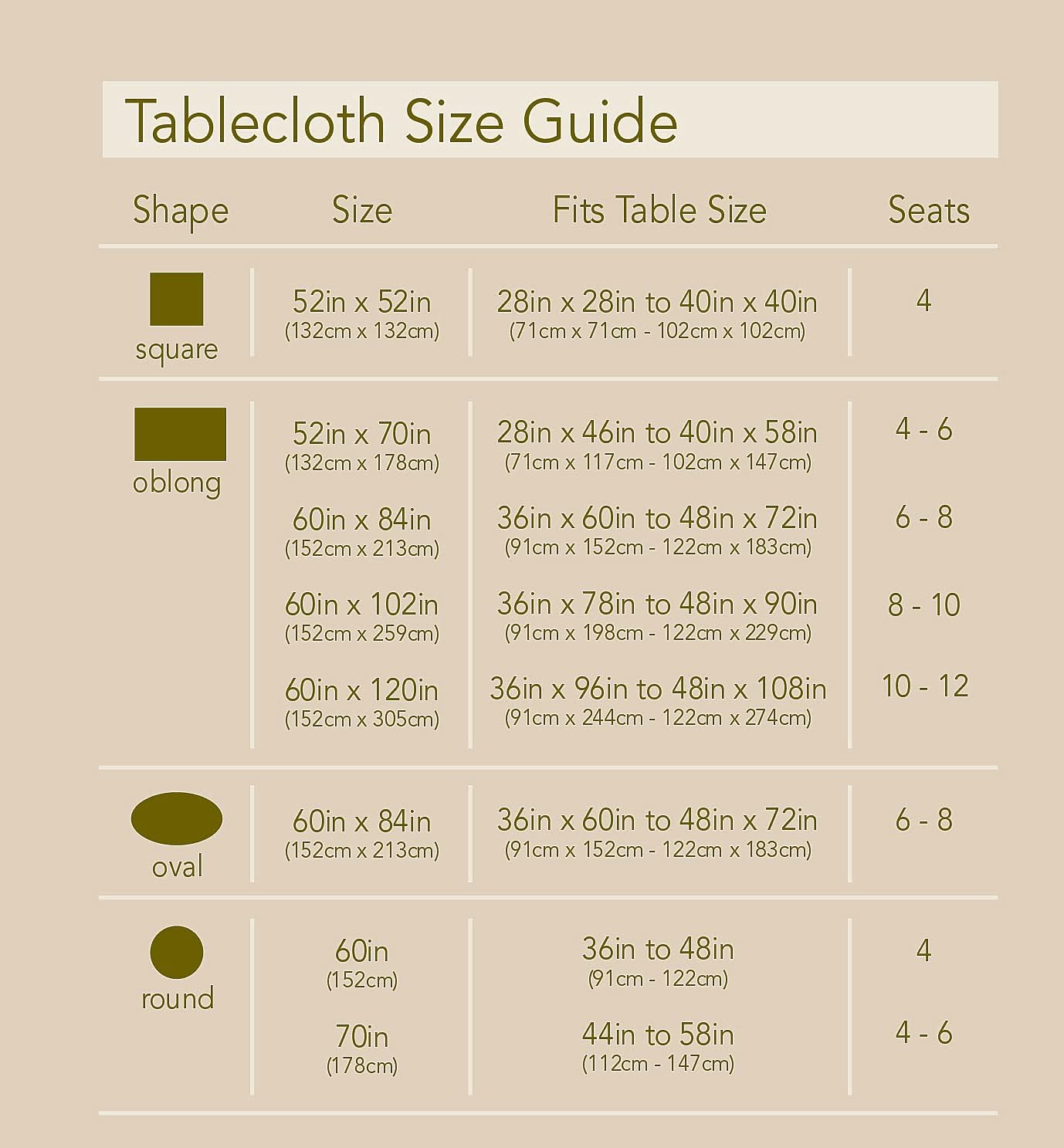 SIZING: 60″ x 84″ Oval (152 x 213cm) – Fits tables from 36 Inch x 60 Inch to 48 Inch x 72 Inch and Seats 6 to 8 People – Oval