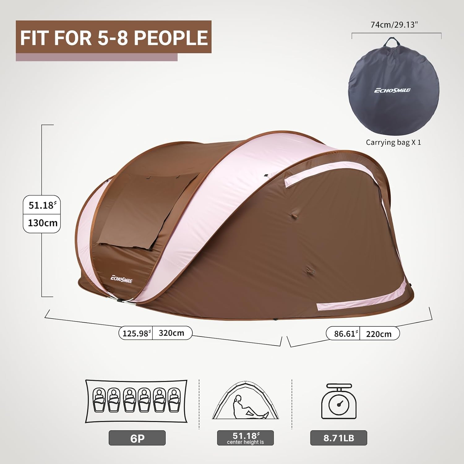 【SPACE】 This instant tent has a spacious room (125.98” x86.61″ x 51.18″) which can fit 6 sleeping bags/pads. It is a good idea to be used as a family camping tent for family trip. Center Height: 51.18″.