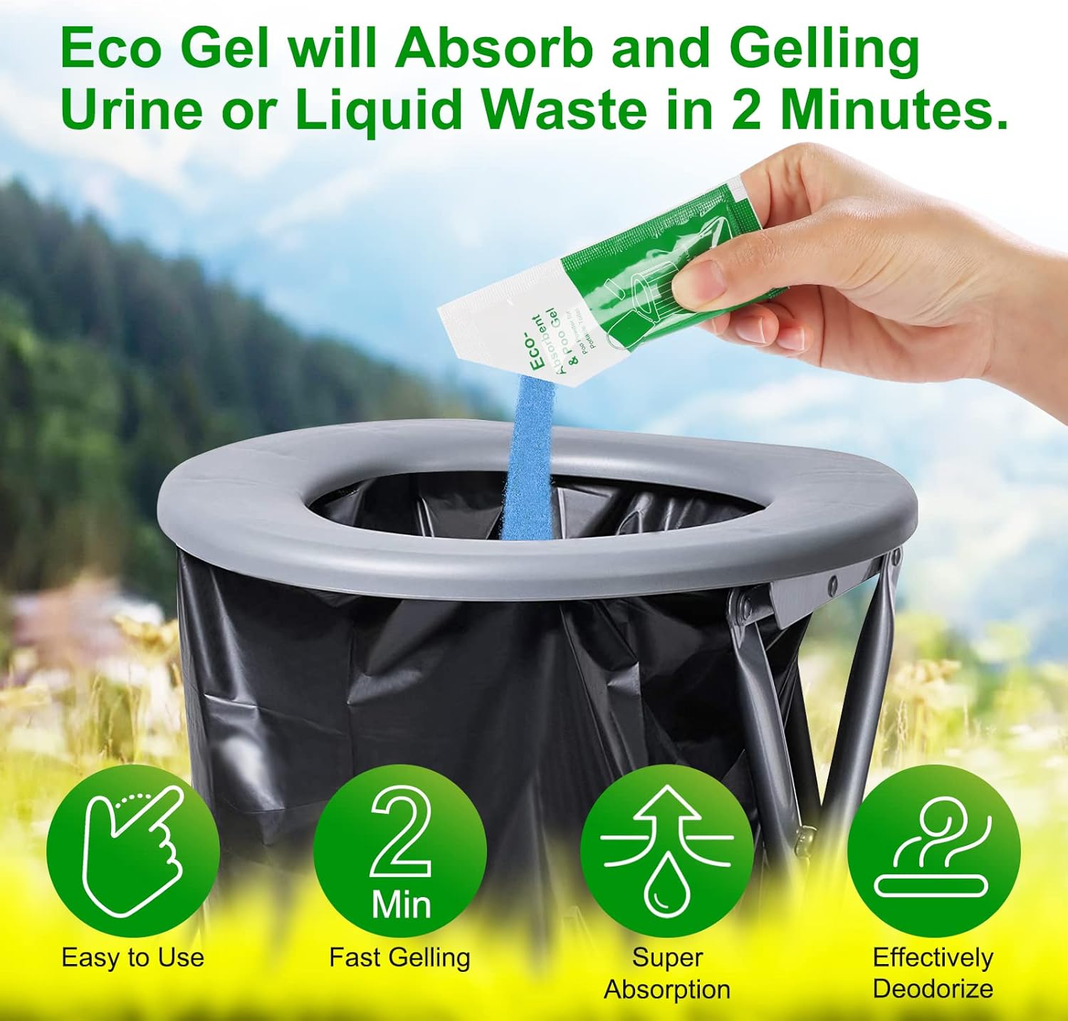 Emergency Preparedness – You May need something like this for your emergency toilet. Perfect for no access to modern conveniences. d to your camping poop bag/camping shower bag to work with biodegradable waste bag and portable foldable toilet.Biodegradable Portable Toilet Absorbent Gel is also suitable for portable toilet for tailgating, RV toilet treatment, travel toilet, portable potty, camp toilet or portable toilet for home use. Avoid confusion , no need to waste water to clean the toilet