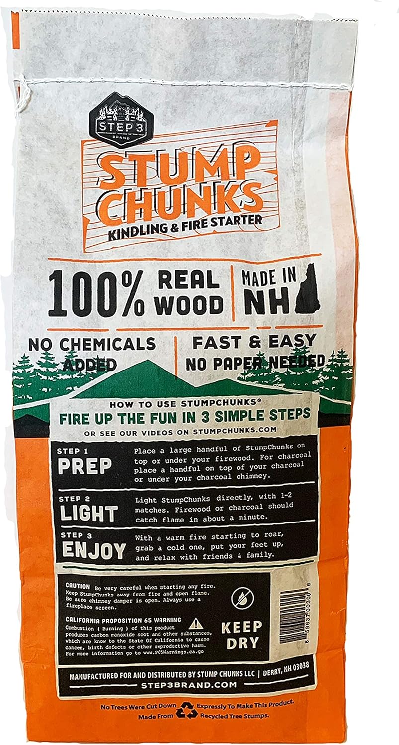 Stump Chunks is a 100% Natural Wood Fire Starter, containing absolutely no chemicals or additives. The secret is in the stump itself. Instead of spending time trying to light your fire you can use Stump Chunks and spend more time enjoying yourself with loved ones. Perfect for charcoal grills and smokers, fire pits, fireplaces or wood stoves. Made in the USA.