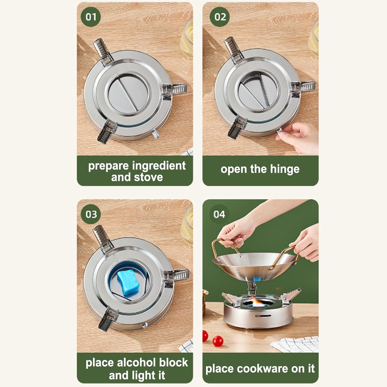 No Power Needed: The camping alcohol stove operates without electricity, burning liquid or solid alcohol for convenient fast cooking during outdoor adventures, ensuring ease of use in remote locations while enhancing your experience with its dependable performance on hikes, campsites, or picnics