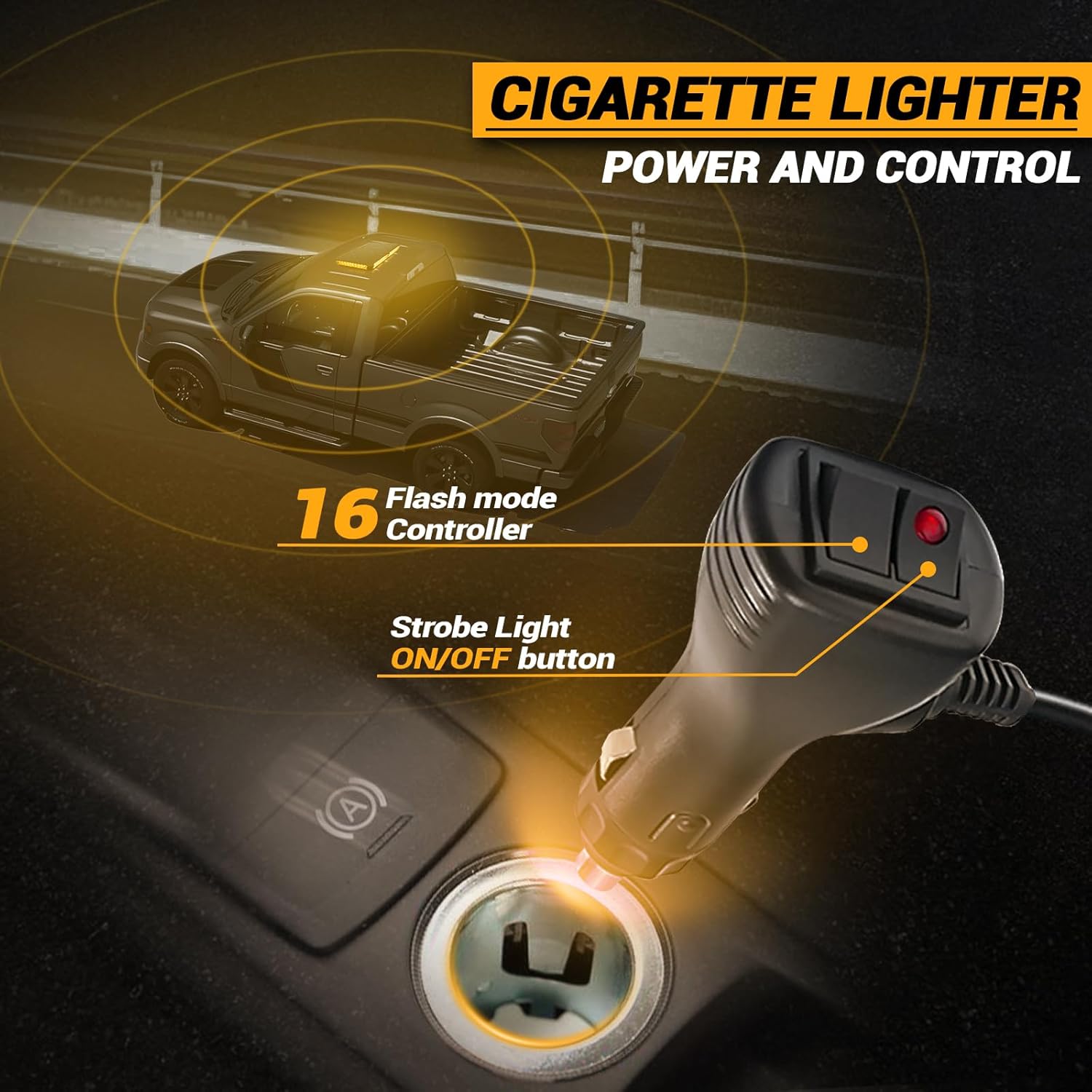 16 FLASHING PATTERNS–Double switch buttons setting, 16 Patterns to choose from. You can switch ON/OFF or select the flashing mode conveniently at the cigarette lighter plug buttons. Last used pattern recall/memory function. Whether you need a steady light, fast strobes, alternating patterns, or synchronized flashes, this hazard caution light bar has you covered