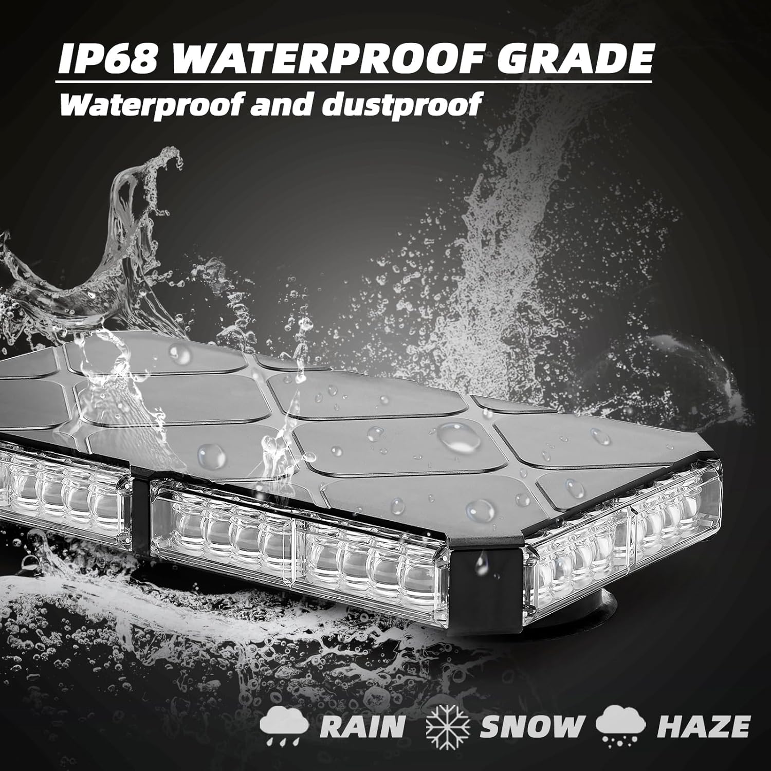 IP68 WATERPROOF GRADE – The Emergency Warning LED Strobe Light Bar is made of high-quality ABS and PC lens & sealed weatherproof build, Professional-grade design, waterproof with IP68, and over 500,00 hours life span. Great to use in rain, fog, dust, and snow weather, resisting moisture and vibration, escorting your driving
