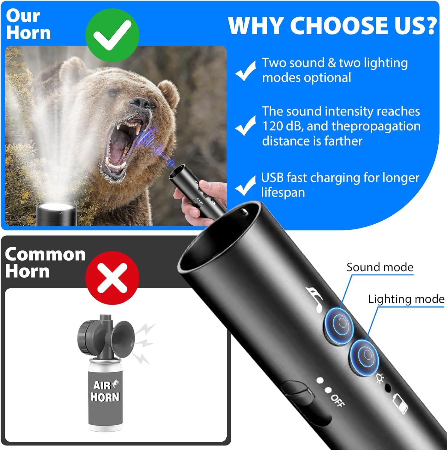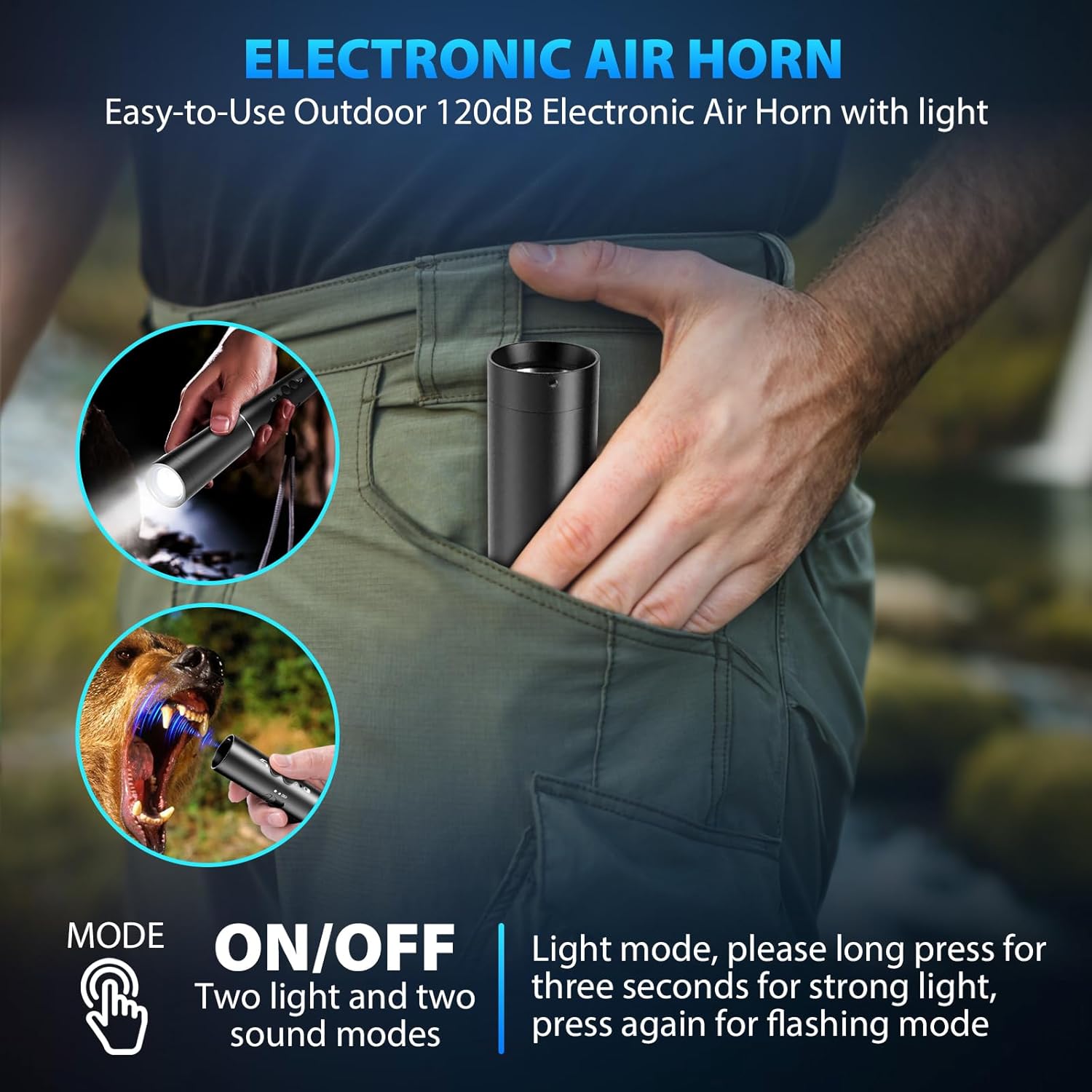 Dual Function Design – This rechargeable bear horn combines two essential outdoor safety tools: a powerful air horn sound on one end and a bright flashlight on the other. An ideal wildlife deterrent for hikers and campers