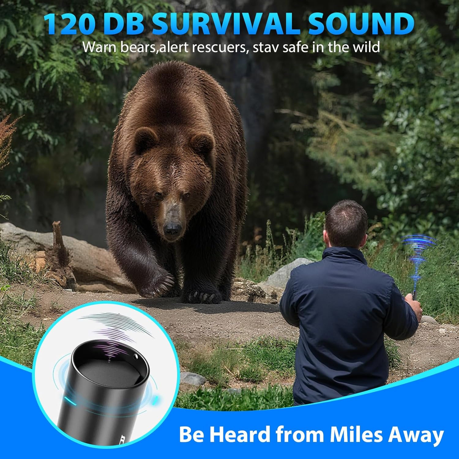 Loud & Effective Sound Modes – Features two alarm options: a sharp animal horn blast and a continuous long whistle. The high-decibel function effectively scares away bears and other wildlife, giving adventurers reliable protection