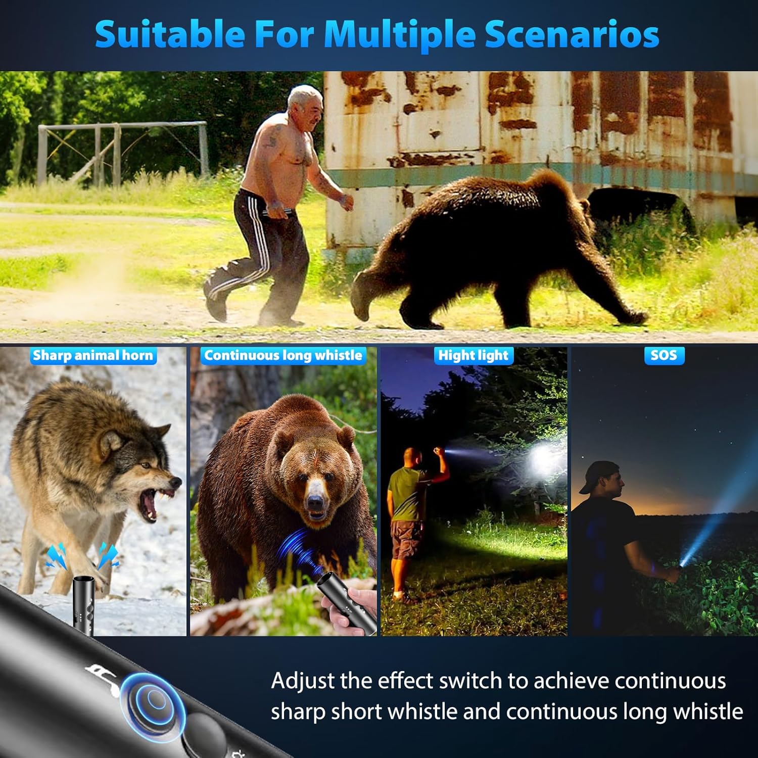 Loud & Effective Sound Modes – Features two alarm options: a sharp animal horn blast and a continuous long whistle. The high-decibel function effectively scares away bears and other wildlife, giving adventurers reliable protection