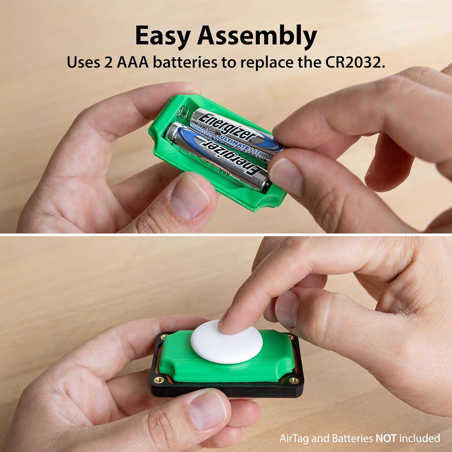 Ultra-compact design.Over 5x more battery capacity than a AirTag’s CR2032 coin cell.Uses two AAA batteries (NOT INCLUDED). We recommend Energizer Ultimate Lithium for longest life.Easy assembly: Remove AirTag’s battery and metal door, place on custom contact. Insert AAA batteries. Screw together with included 2.5mm hex wrench.IP69 Waterproof.Ultra-strong fiber reinforced composite construction.The ultimate peace of mind: 12 months goes fast, and the last thing you want is a dead AirTag on something you value. Great for vehicles, trailers, motorcycles, luggage, camera bags, backpacks, snowmobiles, tool boxes, etc.Patented.