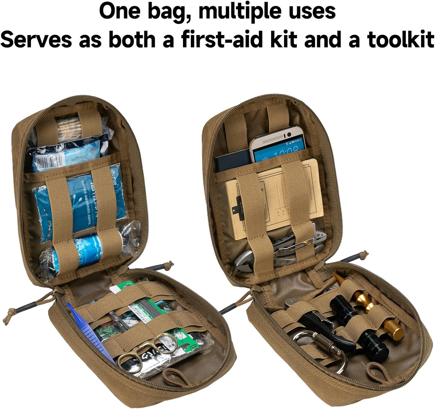 【PREMIUM QUALITY】 The First aid pouch is made of high-quality 500D Cordura Nylon, which is tear-resistant and water-repellent, providing excellent protection for your first aid supplies.Two-way YKK zippers.operates with silky smooth flexibility and front loop panel can paste your favorite patches or logo
