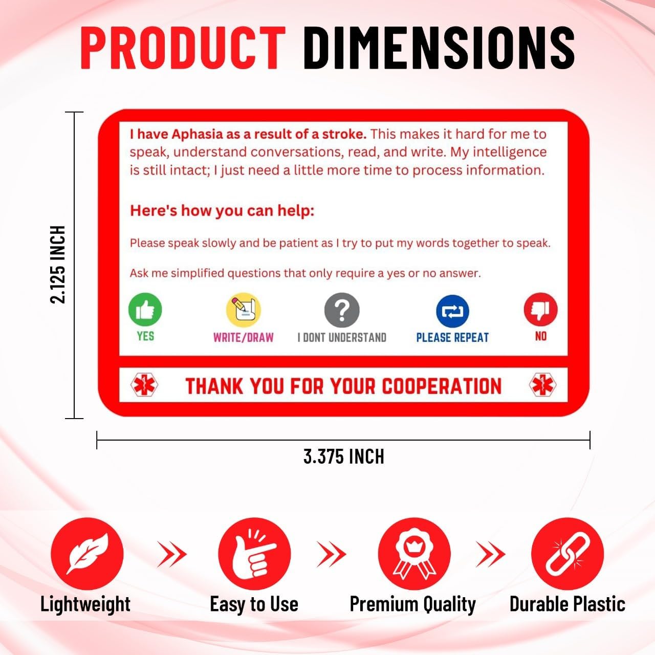 Enhance understanding and support for individuals with Aphasia, promoting inclusivity and empathy. Carry this discreet aid for clearer interactions, signaling Aphasia status and facilitating simplified communication methods.
