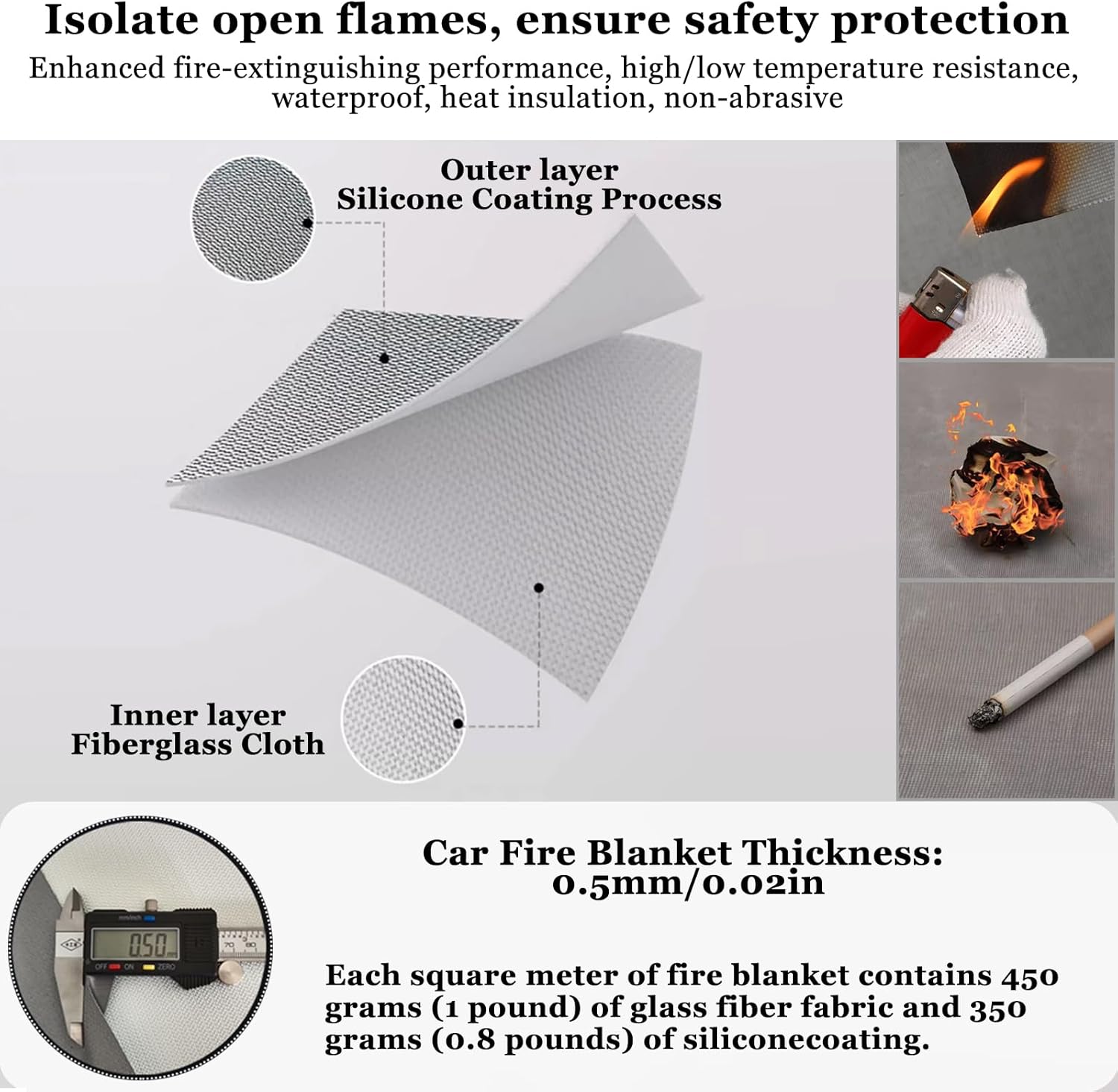 All-round Protection: car fire blanket is made of glass fiber fabric with a double-sided silicone coating, offering five key properties: fire resistance, high-temperature resistance, flame retardancy, waterproofing, and thermal insulation. With an average thickness of 0.5mm/0.02in, each square meter contains 450g of fiberglass fabric + 350g of silicone. It operates at temperatures up to 850°C/1562°F and has a melting point of 1100°C/2012°F. Weighing a substantial 41kg/90lbs, it confidently handles emergencies like vehicle fires