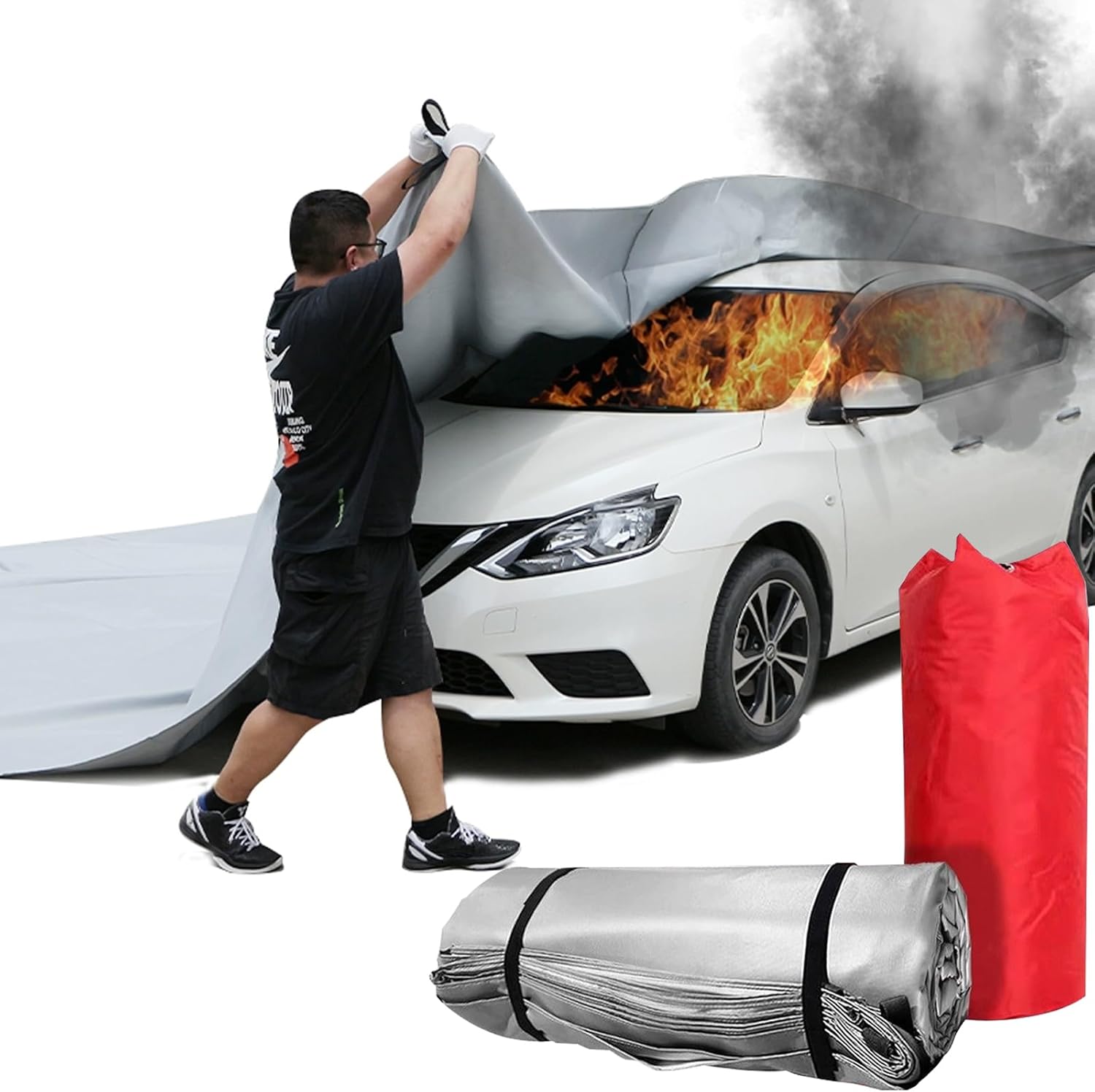 Versatile Application: Measuring 6x9m/19.7×29.5ft, the vehicle fireproof blanket’s oversized dimensions provide extensive coverage. It delivers comprehensive protection for emergencies involving electric bikes, car fires, fixed locations like parking lots, highway tunnels, and auto repair shops, as well as non-vehicle scenarios such as warehouses, kitchens, and campsites.