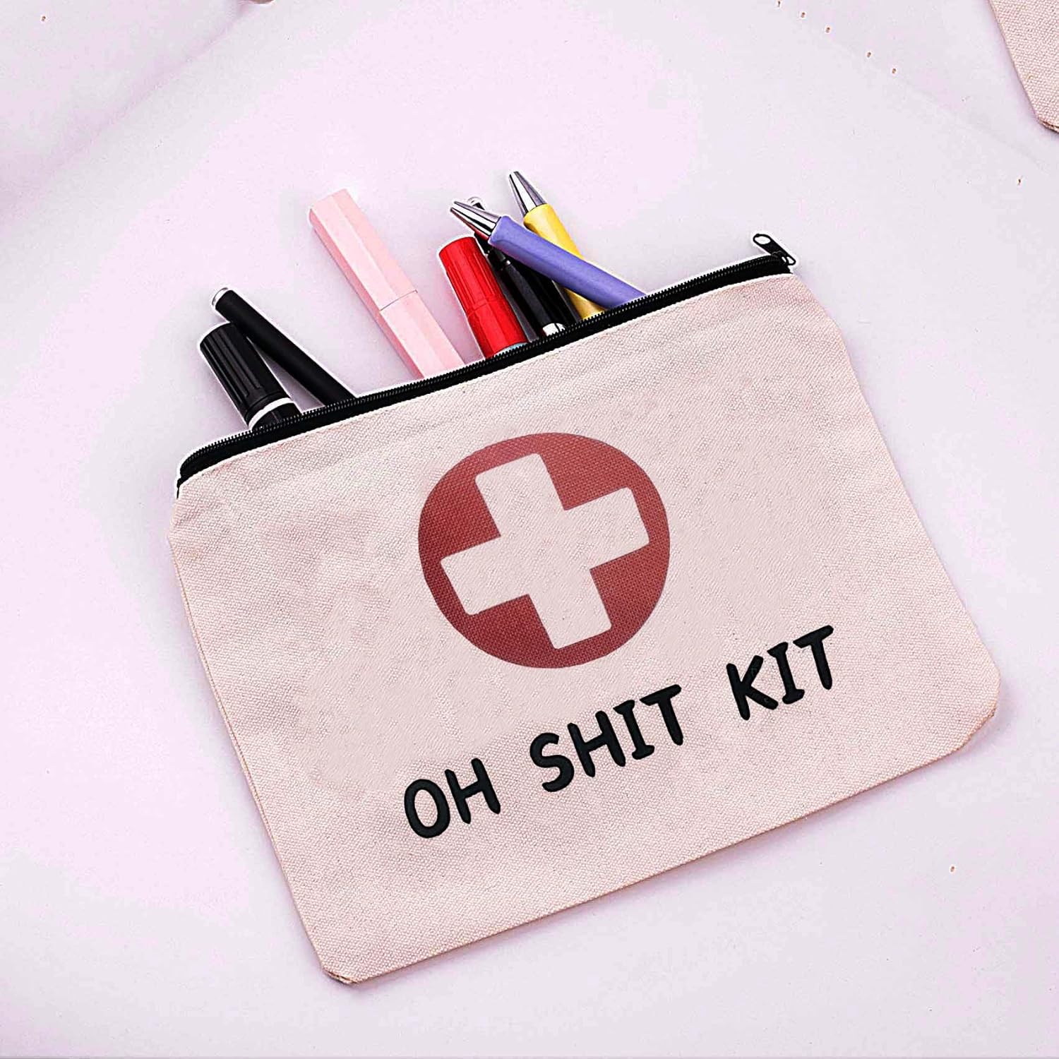 DESIGN FEATURES: Canvas makeup bag with humorous emergency kit design and red cross symbol on white background