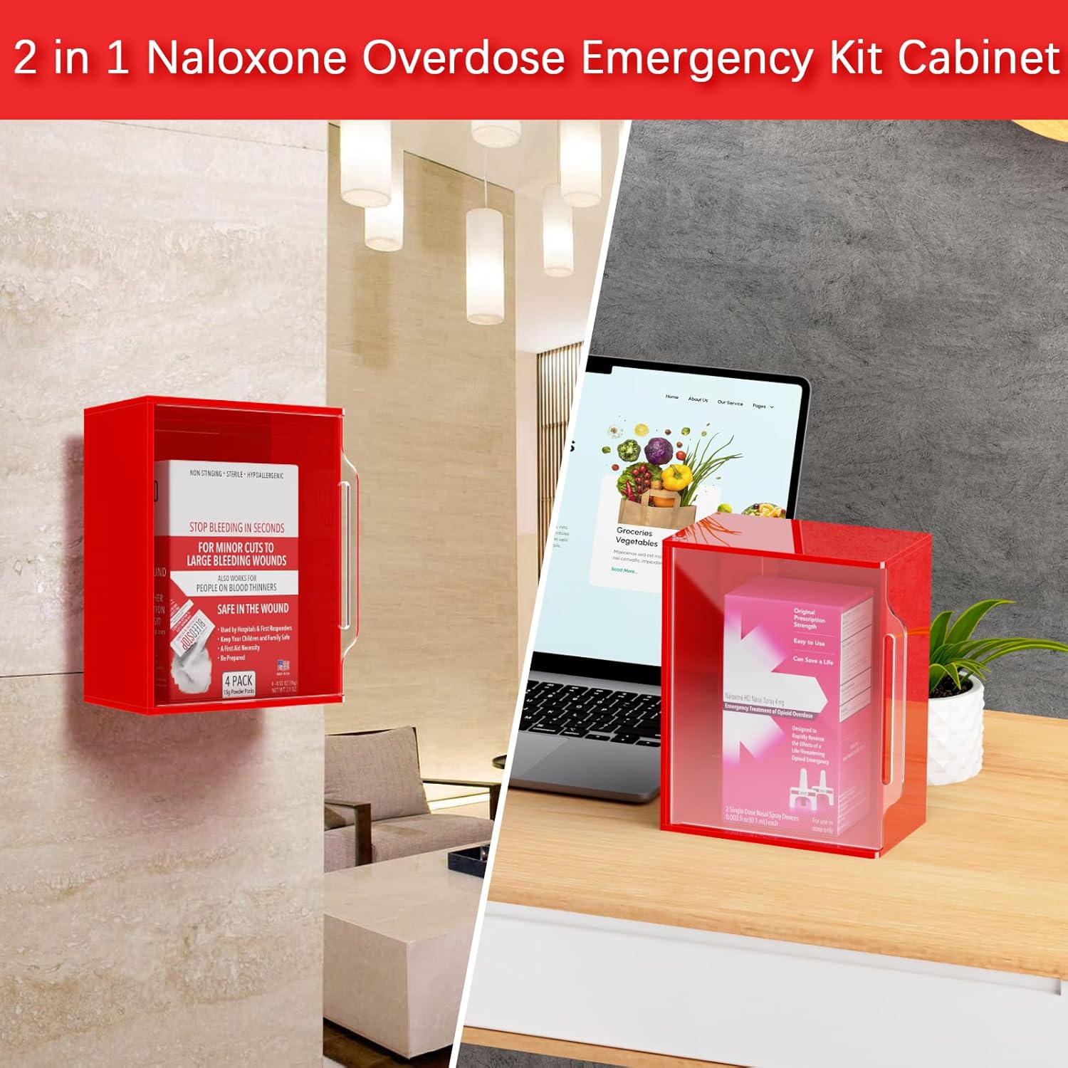 Highly Visible: The cabinet body is made of Eye-catching red acrylic material and fully clear front cover to display Naloxone medication boxes, bleeding control kits & medical accessories for quick identification.