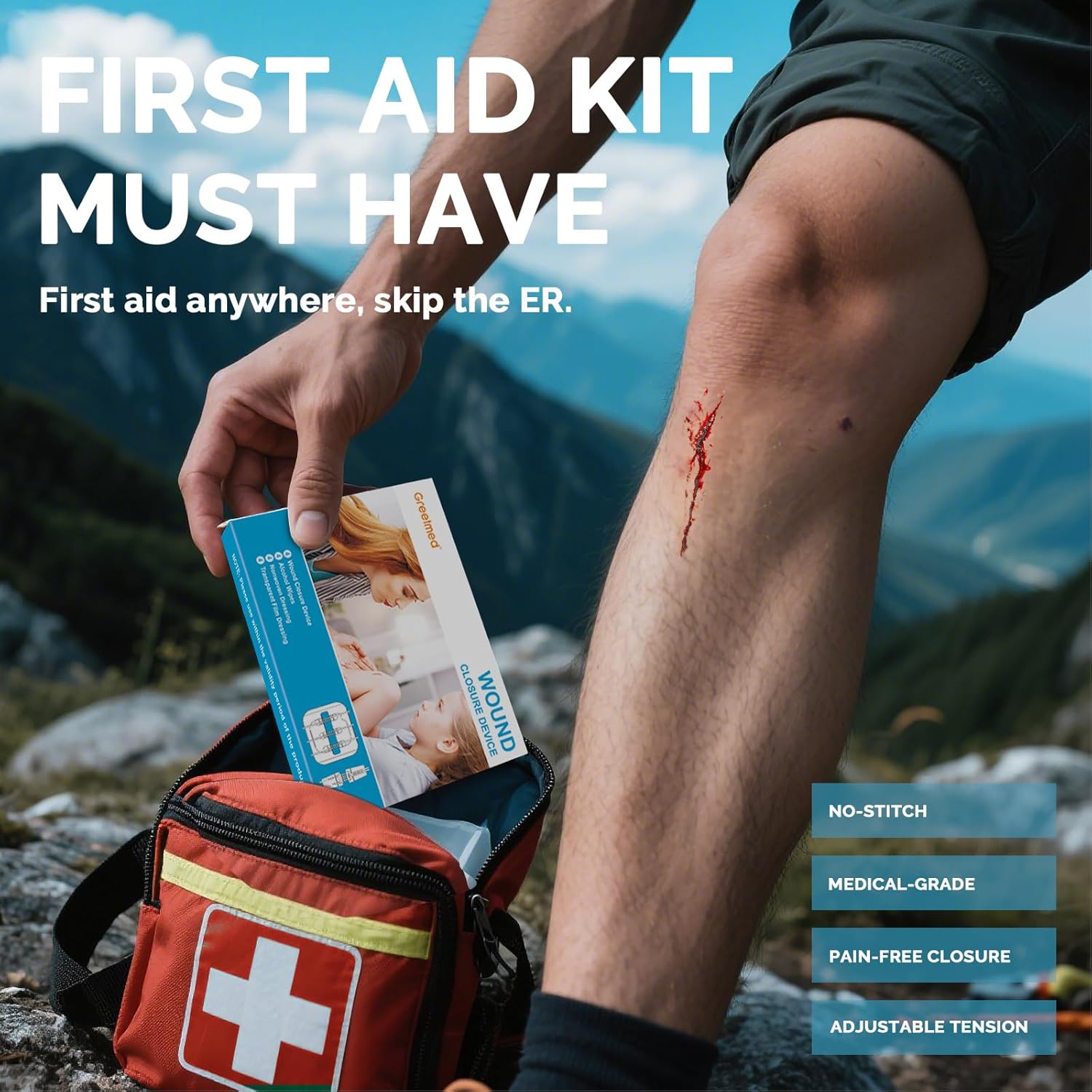 【Essential for Emergencies】Greetmed steri strips wound closure device is the perfect solution for closing wounds in emergencies. Each medical grade suture kit includes two types of 4 emergency wound closure devices, 4 professional alcohol wipes, 4 soft non-woven dressings, and 4 waterproof transparent film dressings. Whether at home, on an outdoor adventure, or traveling, this zipstitch kit provides timely and reliable protection