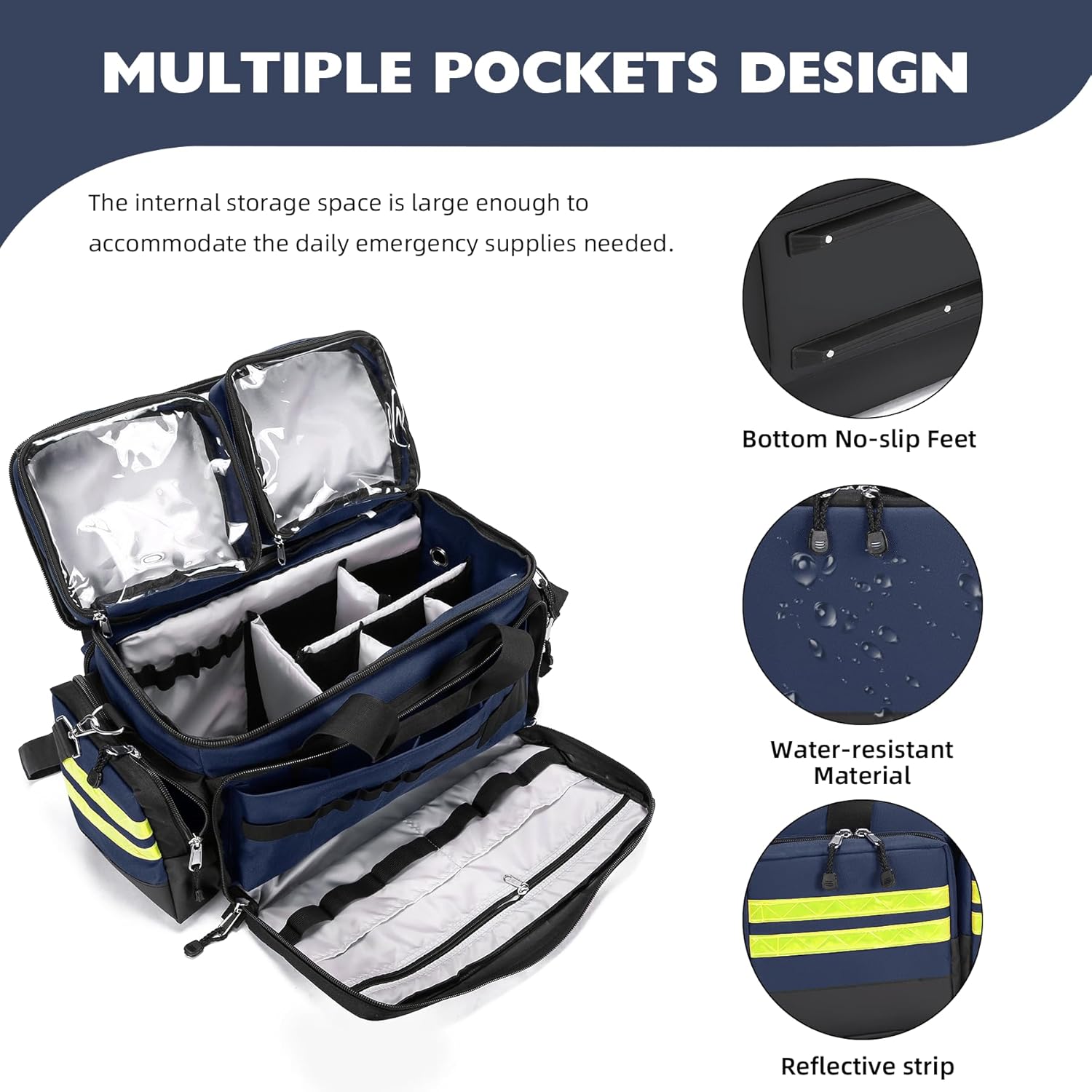 Medical Storage Bag Specifications: Length: 23.62 “ x 11.81“ x13.78“,Main Compartment Dimensions: 17.72“ x 8.27” x 11.81″. This emergency bag accommodates ample daily first-aid supplies. Constructed from durable tear-resistant nylon with PE foam padding, precision stitching, heavy-duty zippers, and a non-slip base with reflective strips for comprehensive emergency supply protection.