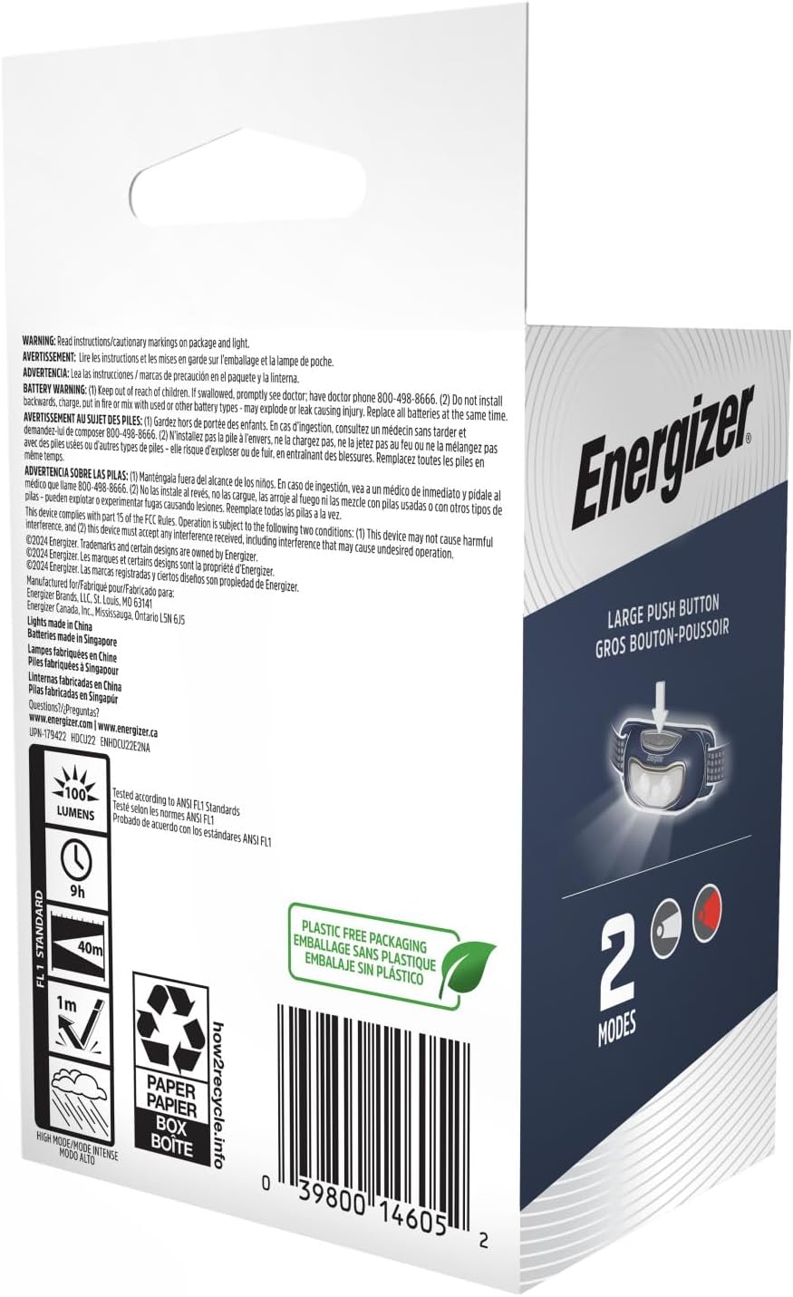Energizer Universal Plus LED Headlamp offers a lightweight, compact hands free light for versatile use with optimal comfort. Perfect any time you need hands free light, this compact headlamp is perfect for outdoor lighting, indoor DIY projects or any activities that require two hands. This Energizer headlamp provides 100 lumens of light on high mode and illuminates objects up to 40 meters away, giving you ample light right where you need it. With two light modes, this adjustable headlamp includes a high mode with light 12X brighter than standard LED technology; and a red light mode that offers a night vision mode to help you see better in dark conditions. Equipped with a removable, washable comfort headlamp band, this bright light is adjustable to get a secure, comfortable fit. Energizer innovation lights the way.