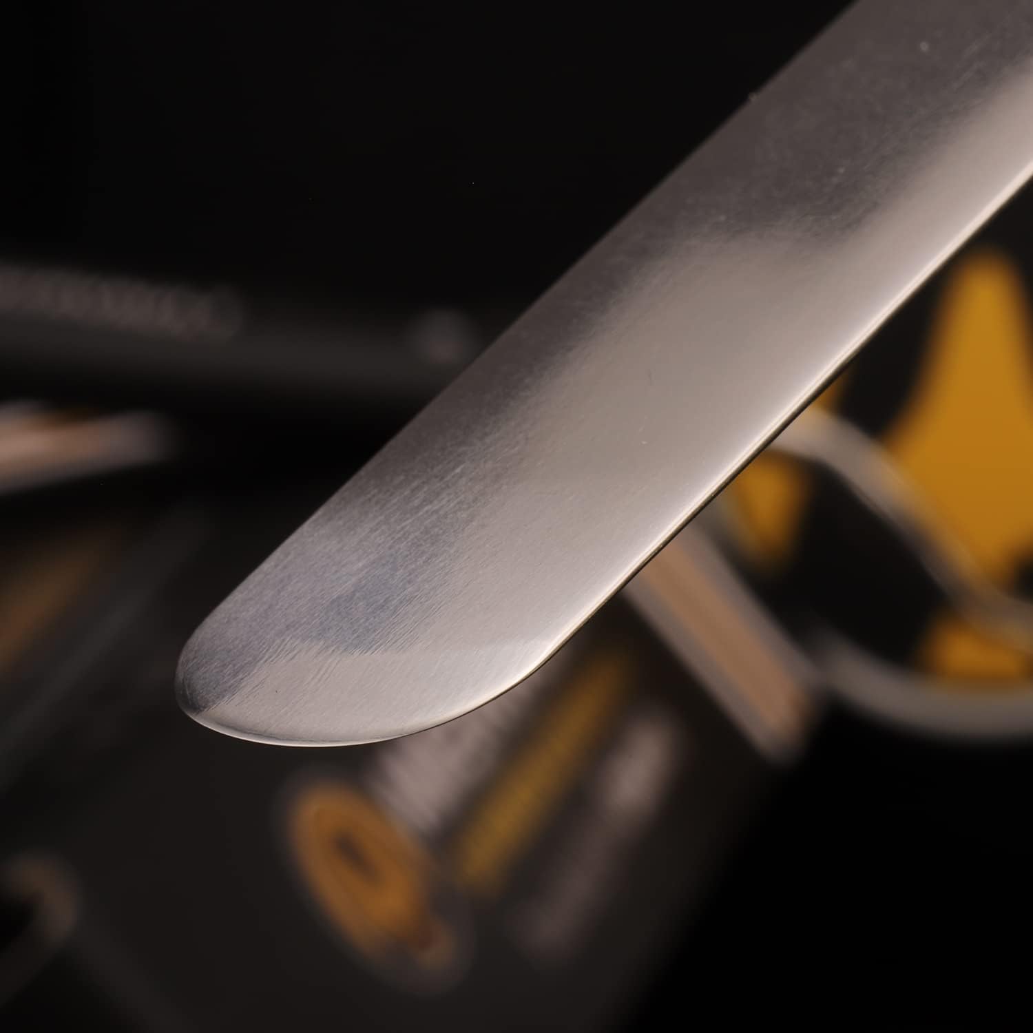 Stiff, hardened stainless steel blades; Flexible but not too thin or flimsy, safer rounded edges, work well with different size objects without damaging them