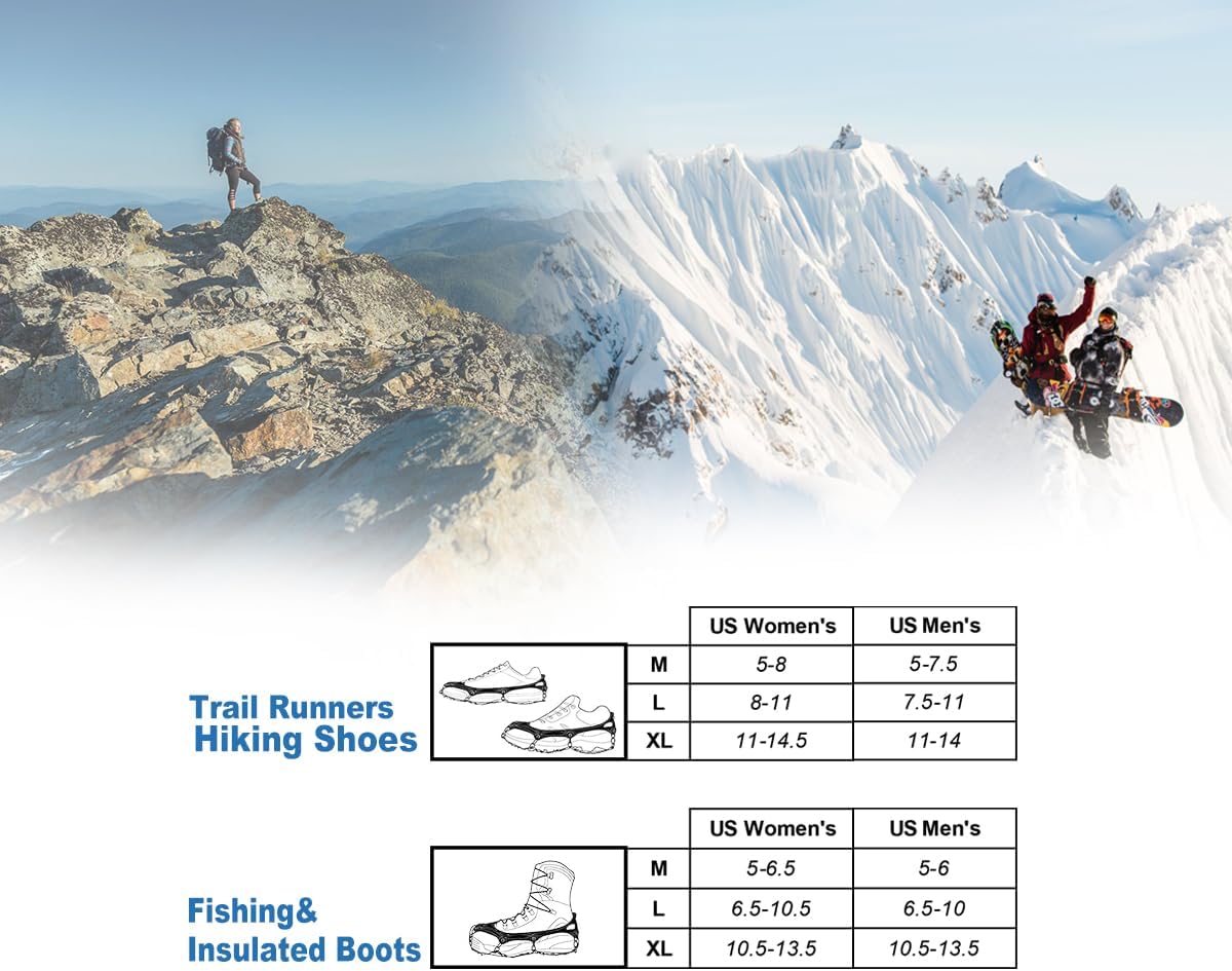 WIDELY USED:Suitable for both male and female of any age of teenagers,adult,elders.Suitable for Outdoor Ice And Snow,hiking angled terrain,icy roads,ice driveway,dangerous sections of trail (ice covered boulders,woods ice mud,etc.)Great for winter trail running,hiking,and ice fishing.