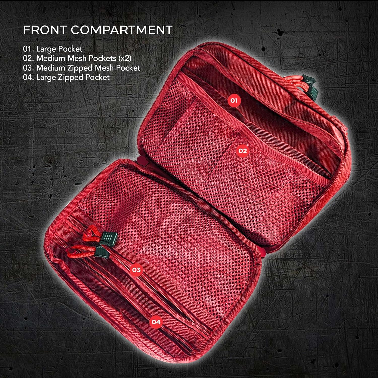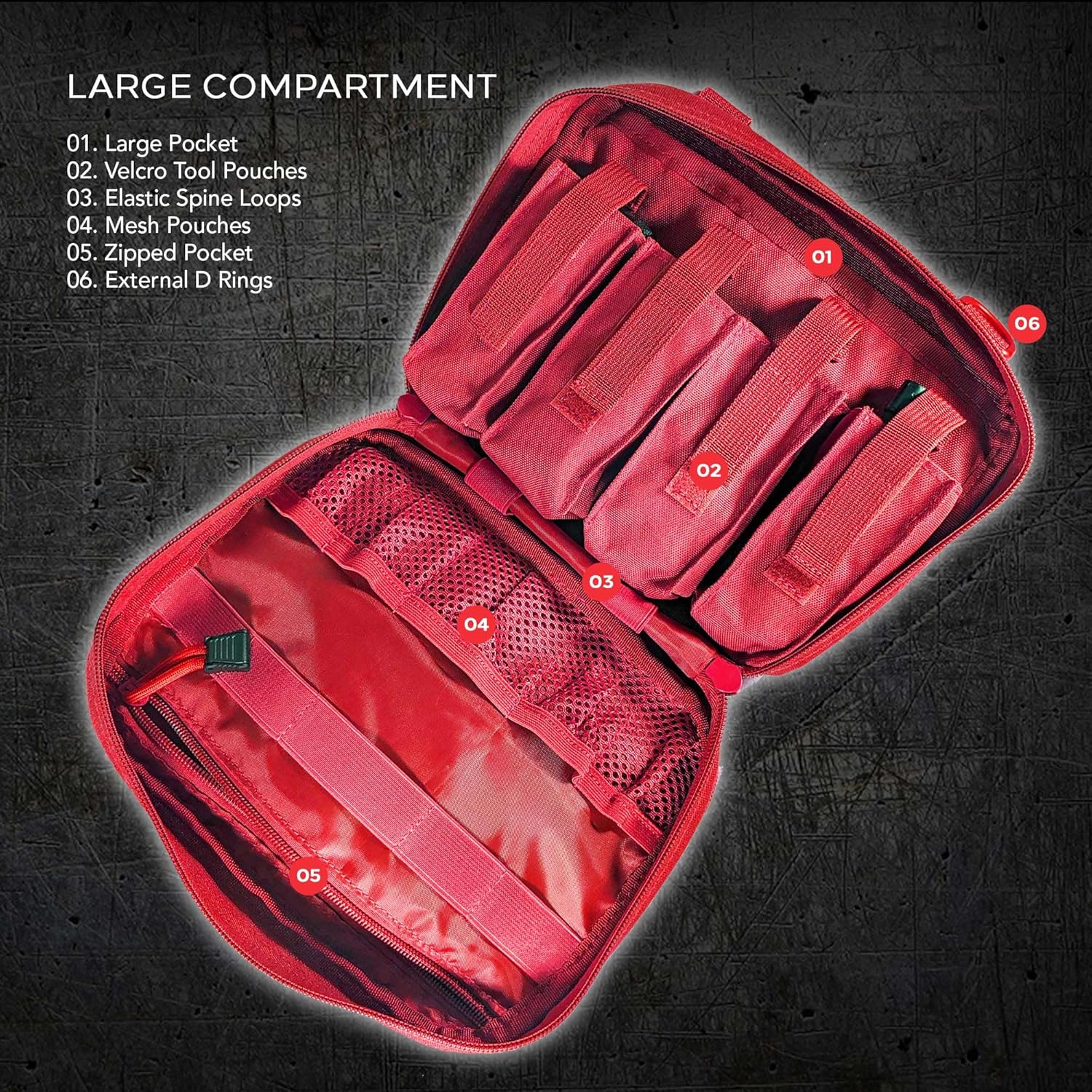 - EMT/First Aid – This bag is perfect for organizing and accessing first aid supplies (IFAK). It has numerous pouches, pockets, and containers for bandages, gauze, medications, tourniquets, compression gauze, scissors, etc.